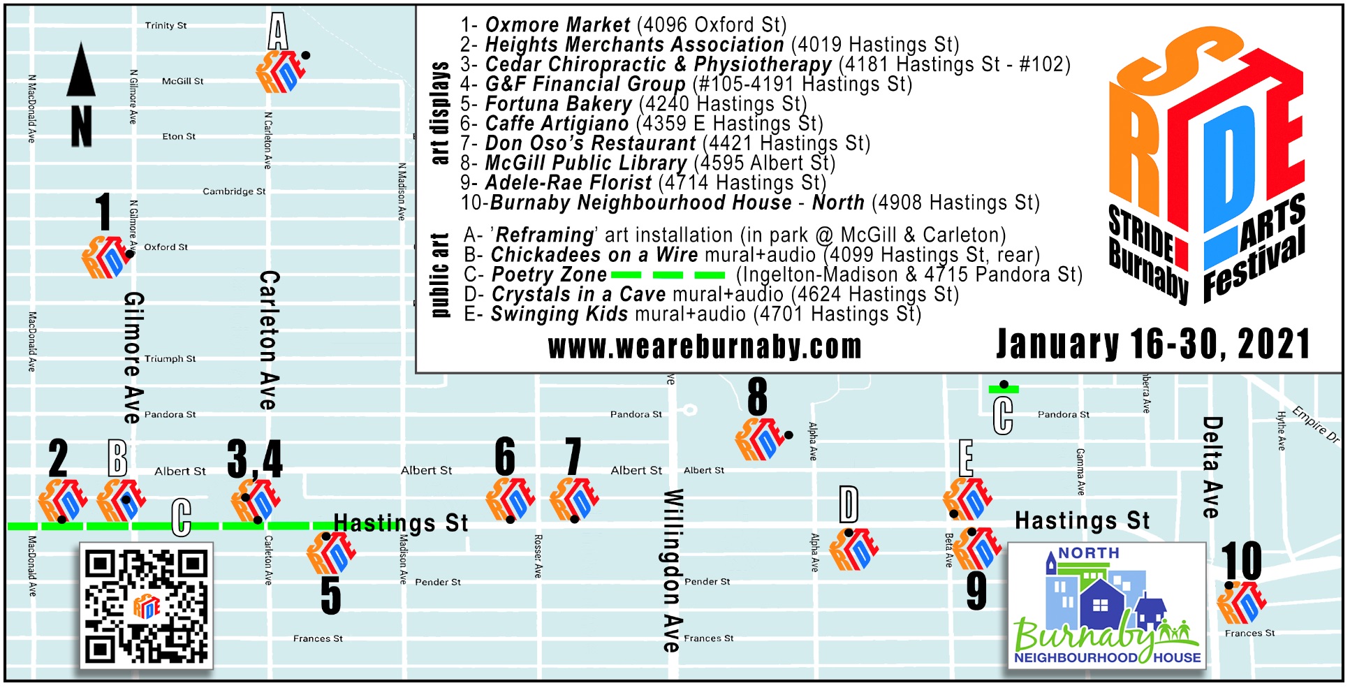 STRIDE Burnaby Arts Festival is your connection to local arts and culture. Running from January 16 – 30, 2021 STRIDE offers educational, entertaining and provocative virtual programs plus safe ‘in-real-life’ experiences all designed to renew our connections with the arts and with each other. Burnaby is a creative and connected community abuzz with art and artists and we have so many ways for you to add art to your lives during and even after the festival. Attend a virtual live music concert or artist studio tour! Participate in a workshop and make some art of your own! Grab your umbrella and explore the STRIDE poetry zone before you visit the numerous local businesses exhibiting Burnaby-made art. You might just find the perfect piece to brighten your home! On January 16, you are welcome to join our Opening Night Reception on Zoom along with the Mayor of Burnaby, some other special guests and the public, starting from 7:30 pm. Made by neighbours for neighbours, STRIDE is part arts festival, part community catalyst, and all fun. Let’s celebrate Burnaby’s art and soul! Please visit the STRIDE website at WWW.WEAREBURNABY.COM to learn more. Meet our artists in the Profiles section, then check out our map and schedule to make your own STRIDE action plan. Don’t forget to follow us on Instagram and Facebook @strideburnabyarts.