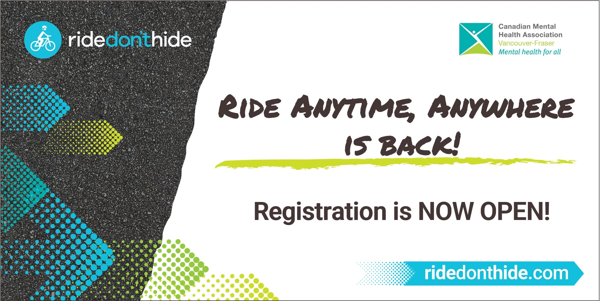 Ride Don’t Hide is the largest mental health bike ride in Canada. But it’s more than a fundraiser—it’s a movement for mental health. Ride Don’t Hide 2021 is a chance to Move More, Give Back and Feel Better. TAKE CARE OF YOURSELF, TAKE CARE OF YOUR COMMUNITY. So many of us don’t feel like ourselves these days, and the pandemic is making it hard to get the help we need. Ride Don’t Hide is a way to take care of yourself and take care of your community. Ride Anytime, Anywhere 2021, our virtual version of Ride Don’t Hide, will take place virtually in the month of June in Greater Vancouver. No matter where you call home, you can ride and raise funds. It’s your ride, your way. In June 2021, thousands of riders—and walkers, runners, yogis, spinners, dancers, families, rope-jumpers, HIIT trainers and more—will come together to ride outside, ride inside or ride in spirit to raise funds for mental health in their own communities. Ride to feel like yourself again. Raise funds for mental health to get one more person the help they need