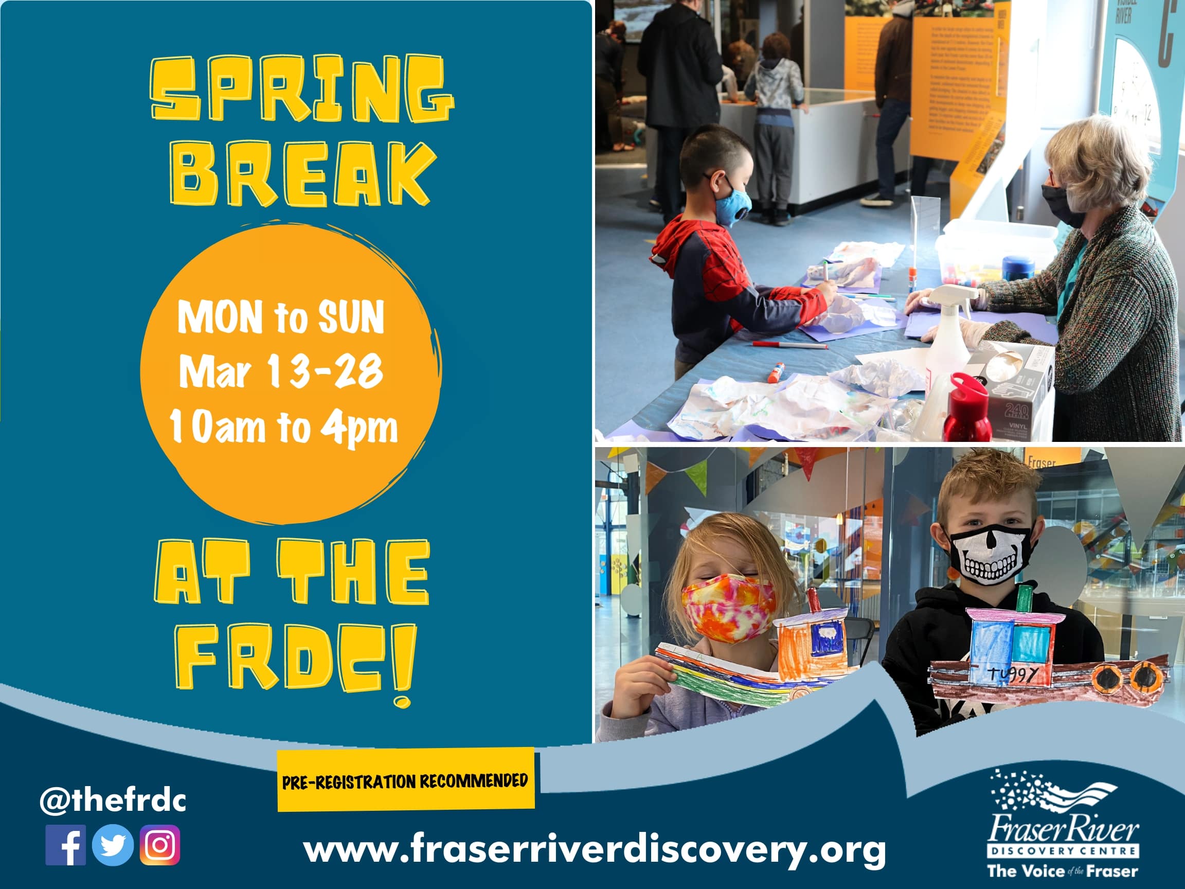 Take a break and spring into the Discovery Centre! This Spring Break, the FRDC is excited to offer two weeks of interactive family-friendly activities, tours, and online programs from Saturday, March 13th to Sunday, March 28th! – At the Centre, we will run interactive activity stations that share our love for the mighty Fraser River in different ways. – Our staff and volunteers will also offer FRDC Exhibit Tours and Quayside Walking Tours, which provide different ways to explore the Fraser River’s economic, environmental, and cultural contributions to the province! – Finally, we will share our online educational programs, FRDC@HOME, featuring DIY craft videos and new episodes of our Sit Spot series, which invite our community to engage with the natural beauty of the Fraser Watershed in new and creative ways! With so much to see and do, you are sure to find something to try out! General Information • Interactive programs are offered at various dates/times throughout Spring Break – see program descriptions below for details. • Pre-registration is required. • Program registration includes admission to the Centre. Pay online when you register, and explore the galleries afterwards! • Individual group size is limited to 1 immediate household of up to five (5) individuals. • COVID-19 safety protocols will be in effect and enforced for all activities and programs during Spring Break. This includes safe physical distance between groups, regular cleaning of FRDC exhibits, and facemasks required for all staff, volunteers, and visitors over the age of six (6). Please visit our website for full details on the programs and tours we will have on offer during Spring Break! https://fraserriverdiscovery.org/springbreak2021/