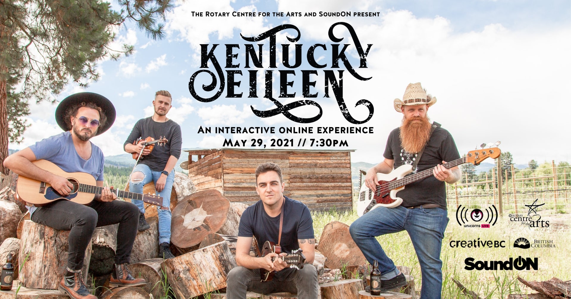 Kentucky Eileen is presented by the Rotary Centre for the Arts with support from SoundON, Creative BC, and the Province of British Columbia. Kentucky Eileen is a brand new folk quartet born from the bush in the South Interior of BC. Based around melodic swells and four-part harmony, four of BC’s most beloved musical personalities comprise the lineup; Joshua Smith (The Trips), Dan Tait (Tiger Moon), Sam Balson (Dope Folk), and Mitchell Howanyk (Wild Son). Inspired by Roger Miller and Ricky Skaggs, this quartet takes traditional American folk music and gives it a supremely Canadian flavour – sonically akin to The Band. They are all multi-instrumentalists, experienced storytellers, and storied entertainers – prepared to bring you a spectacular show. This show is presented with our streaming partner Unicorns.live and will be available after the live stream for on-demand viewing until Friday, June 4. Tickets for the on-demand viewing can be purchased until June 4. Kentucky Eileen is presented with support from SoundON, Creative BC, and the Province of British Columbia.
