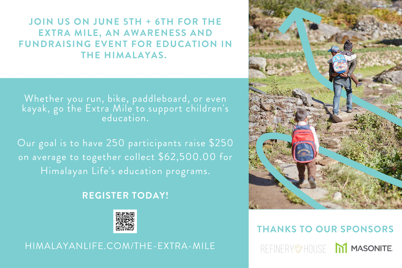 Himalayan Life, a North Vancouver-based charity that exists to enhance children’s lives in the Himalayas, is excited to announce their upcoming virtual fundraising event, the Extra Mile. In the Himalayas, in order to receive education, one needs to go the extra mile. Children walk many miles each day to make it to the closest school. Parents sacrifice income to pay for school fees, and Himalayan Life provides education opportunities for children and families who might otherwise not have the chance. Join us on June 5th + 6th for The Extra Mile, an awareness and fundraising event for education in the Himalayas. Whether you run, walk, bike, paddleboard, kayak, swim, or unicycle, Go The Extra Mile to support education in the Himalayas. Gather your friends and family and create a team to begin raising funds for education! Our goal is to have 250 participants raise $250 on average to collect $62,500.00 for education in the Himalayas. Why go to all this effort? Education is essential in creating thriving children, families, and communities. When a child is educated, the cyclical nature of poverty cannot continue; it gives hope for a better future. If we want to create change globally, we need to work together to offer education to those who have fewer opportunities. Sponsored by Trev Deeley Motorcycles, Refinery House, Masonite, Scout, Beyond the Banks, Arc’teryx, Kaci, and Ann Hurst, the Extra Mile is a collaborative effort. Sign up as an individual, create a team, or join an existing team and then invite your family and friends to join or support you by donating to help you reach your fundraising goal! There will be prizes awarded for the teams and individuals that raise the most money, so be sure to share your progress on social media and tag us (@himalayanlifeinternational) in your posts to help spread the word and invite more people to join in on The Extra Mile. Unable to go the Extra Mile this year? Donate to help a team reach their fundraising goal. Registration is open! Go The Extra Mile On June 5 + 6th for education in the Himalayas! For more information, please visit http://www.himalayanlife.com/the-extra-mile/