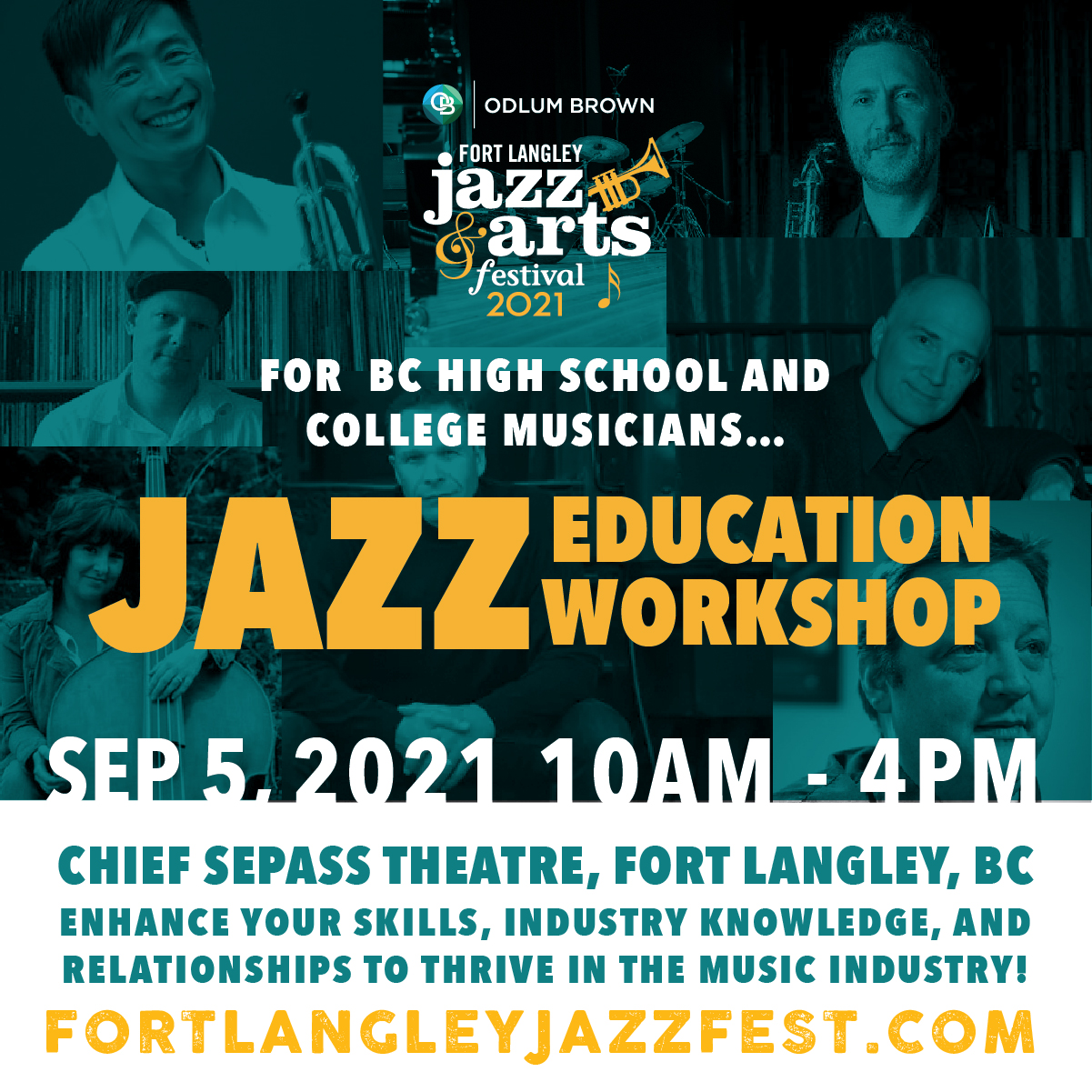 Sunday, September 5, 2021 | 10am – 4pm Chief Sepass Theatre, Fort Langley, BC Enhance your skills, industry knowledge, and relationships to thrive in the music industry! Join us for a full day of personalized music mentoring and coaching from western Canada’s top jazz musicians and educators: Play with pros and peers to boost your improv skills in a supportive, no-pressure environment Get feedback, insights, and knowledge to level up your musicianship Forge relationships with A-list pros and other up and coming musicians Registration: $75 Register early – Limited seats available! Website: https://www.fortlangleyjazzfest.com/jazz-workshop