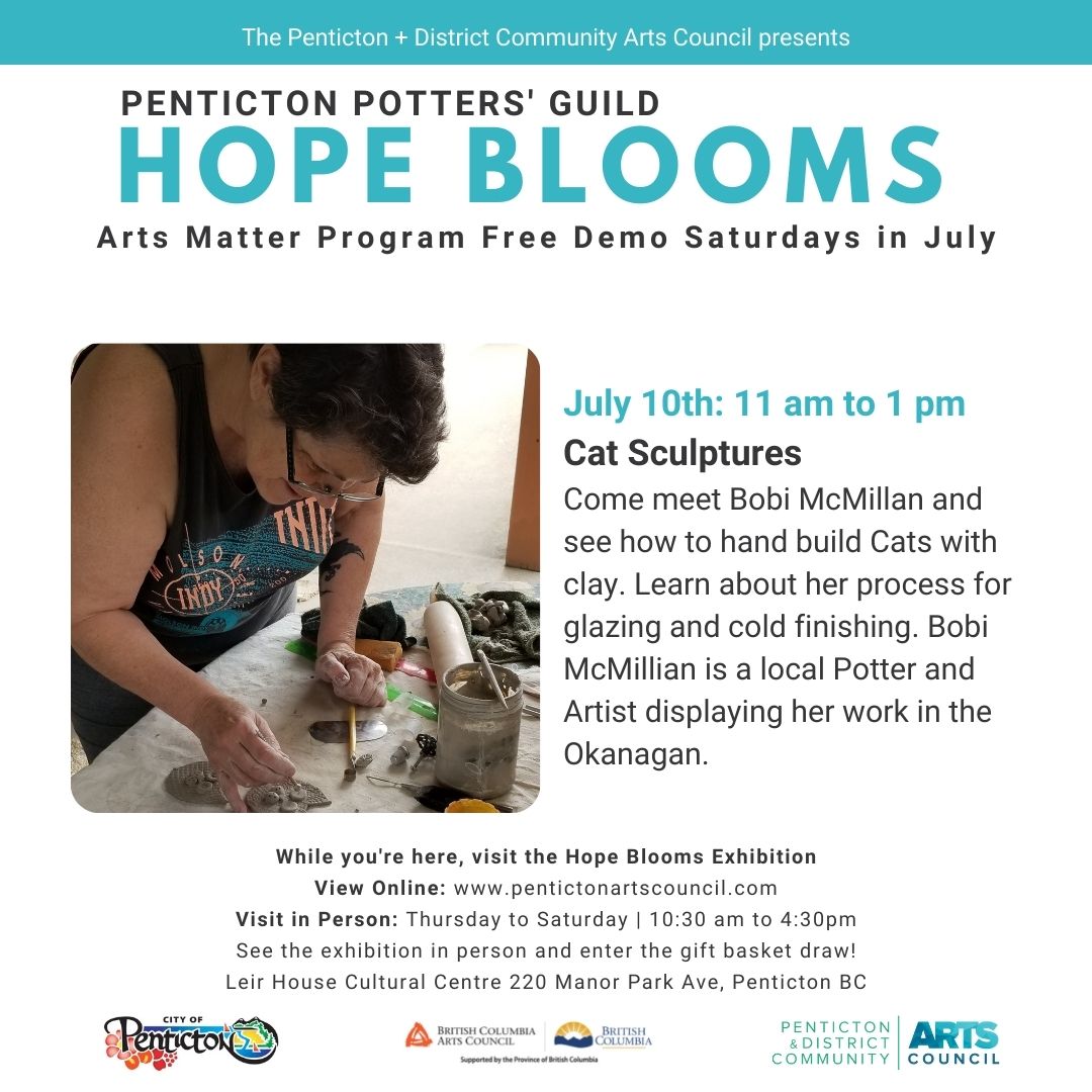 Come meet Bobi McMillan and see how to hand build Cats with clay. Learn about her process for glazing and cold finishing. Bobi McMillian is a local Potter and Artist displaying her work in the Okanagan.