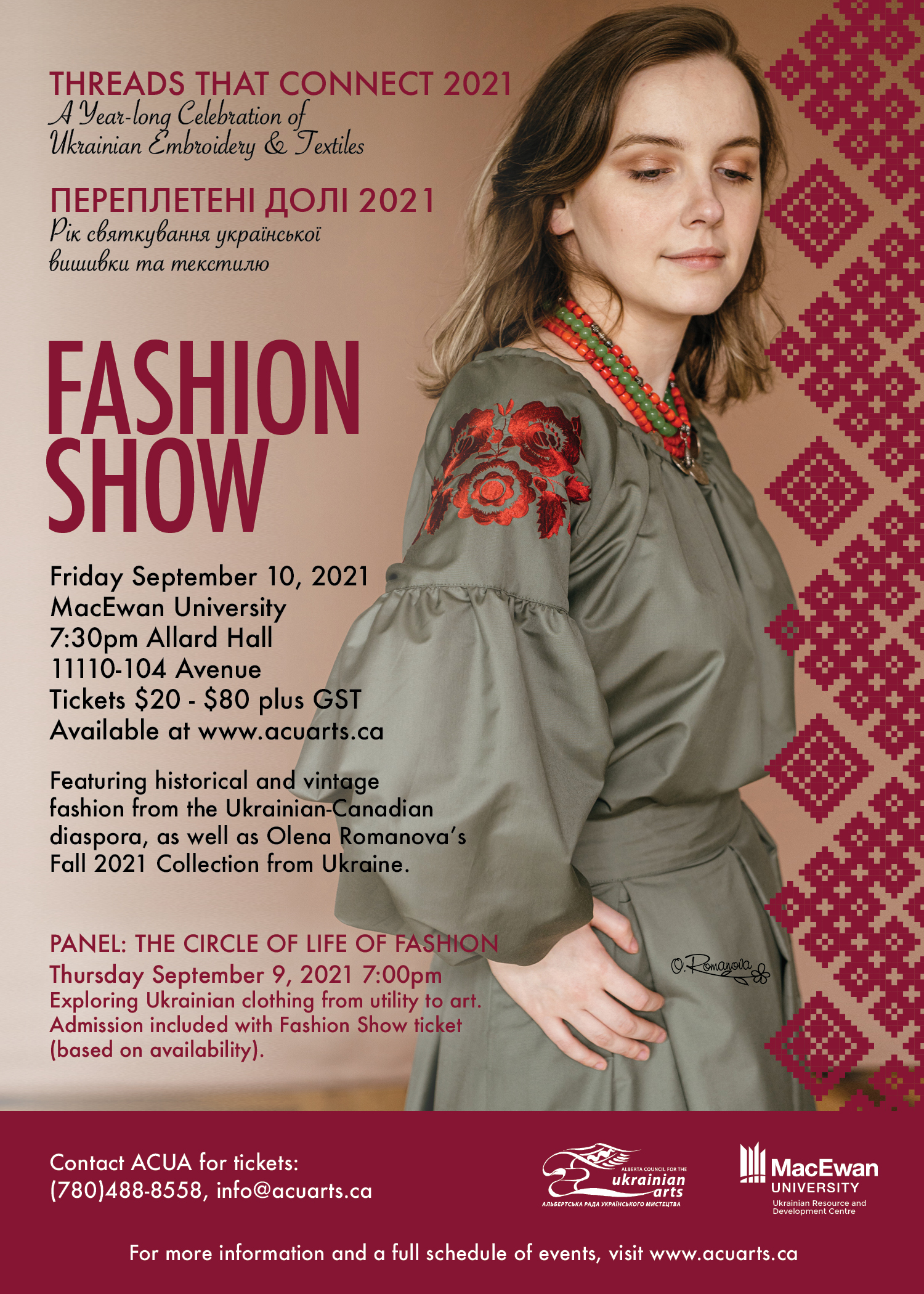 Join us for a fashion show featuring historical and retro fashion from the Ukrainian-Canadian diaspora, as well as Olena Romanova’s contemporary Fall 2021 Collection from Ukraine. Take a journey through time as Ukrainian embroidered fashion is modelled on the runway for the first time in Edmonton. Based on availability, Fashion Show tickets include a free admission to the panel “The Circle of Life of Fashion” on September 9 at 7PM. Fashion designers and business owners will discuss the evolution of Ukrainian clothing as a reflection of the environment, utility and cultural heritage to fashion, design and art. For your free registration to “The Circle of Life of Fashion” panel, please call the TIX on the Square box office at 780-420-1757. There will also be a Threads That Connect Marketplace on Saturday, September 11th. The marketplace is open to the public, no ticket required. Featuring items from local and Ukraine-based artists and designers, you can shop products that showcase the beauty of Ukrainian textile arts.