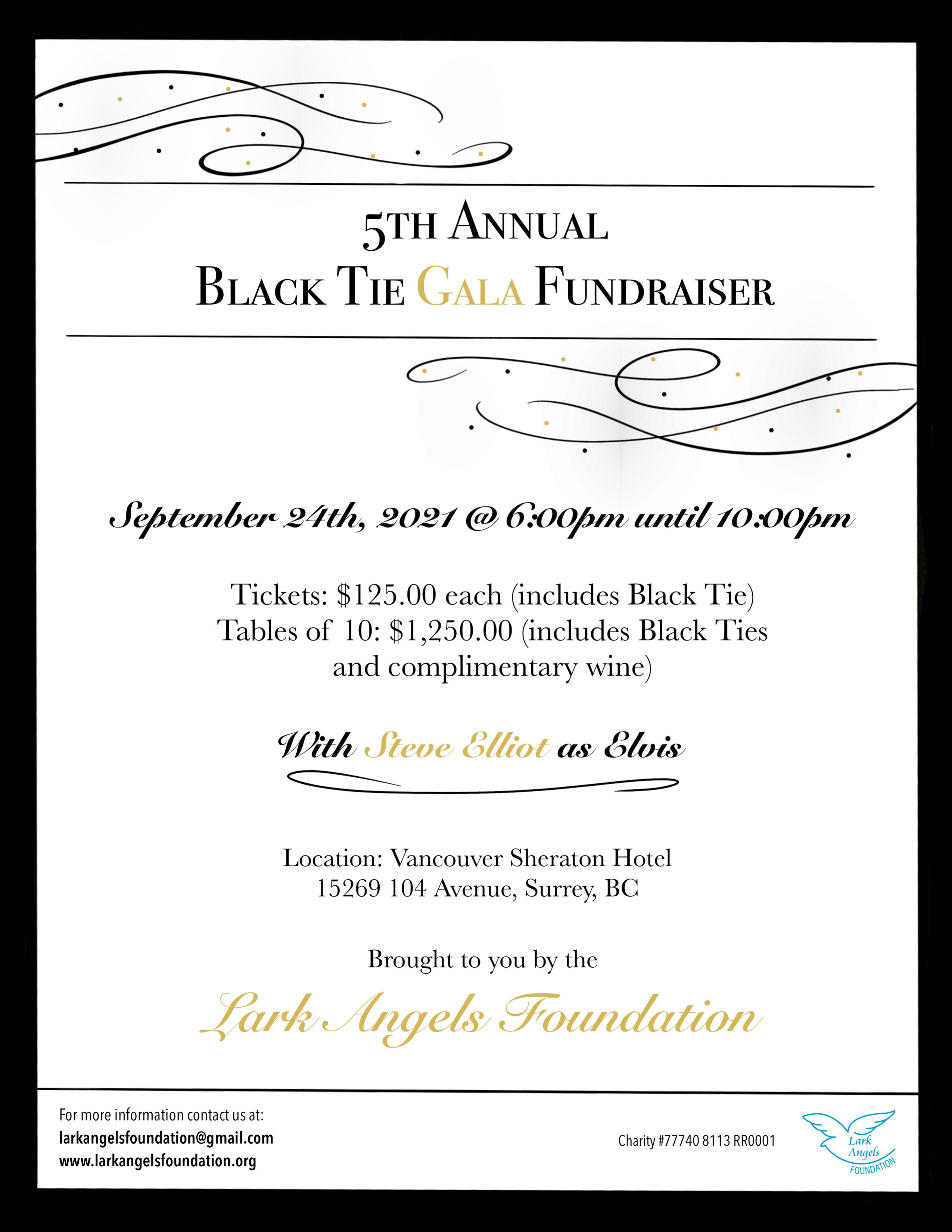 Our Annual Black Tie Gala Fundraiser, with Steve Elliott as “Elvis Elite” All subject to Bonnie Henry’s Sept 7th COVID ruling. Lark Angels Foundation is a charitable organization dedicated to improving the lives of our senior population with Dementia, PTSD and other brain disorders through Sensory Stimulation.