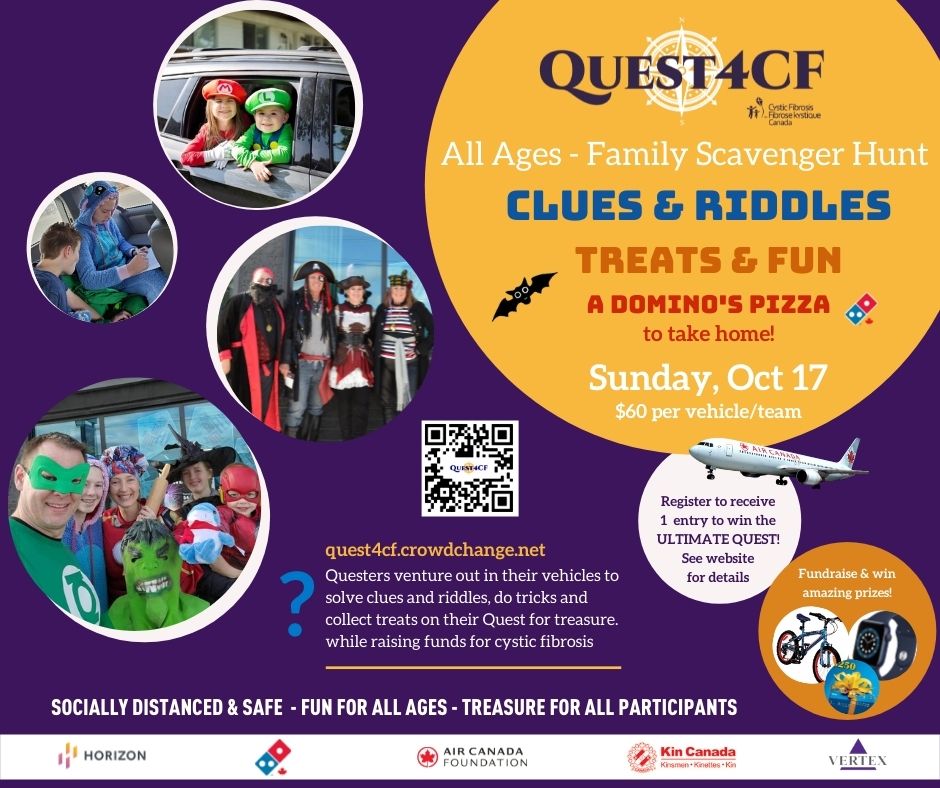 Questers will travel via their own vehicle (1 vehicle per team) throughout Regina solving clues and trick or treatin’ their way to the hidden treasure chest. The event will be socially-distanced and the majority of the clues will be solved in their vehicle. As teams complete their Quest, a volunteer will stamp your Quest Passport and provide clues to upcoming locations. Once your Quest is complete, you will proceed to the final location to receive your “gold” from the treasure chest! All Questers are encouraged to “dress for the Quest” and wear their Halloween costumes for their journey. There will be trick-or-treat stops and goody bags throughout the journey. $60 per vehicle Registration includes: – Map and clues for Quest – Treats at clues stops along the route – Fundraising incentives & prizes including best costumes – A treasure for EVERY Quester at the end of the journey! – A large pizza 3 topping pizza donated by Domino’s – A great adventure for all ages to enjoy! Register for Quest4CF between August 25th – October 10th you receive one (1) entry for a chance to win 2 economy class tickets to any Air Canada scheduled destination in North America (including Hawaii, Mexico, and the Caribbean). See full contest roles on website, including how to receive more entries into the draw. HURRY!! Space is limited to only 50 vehicle registrations in Regina! Don’t miss your chance to choose your Ultimate Quest! quest4cf.crowdchange.net