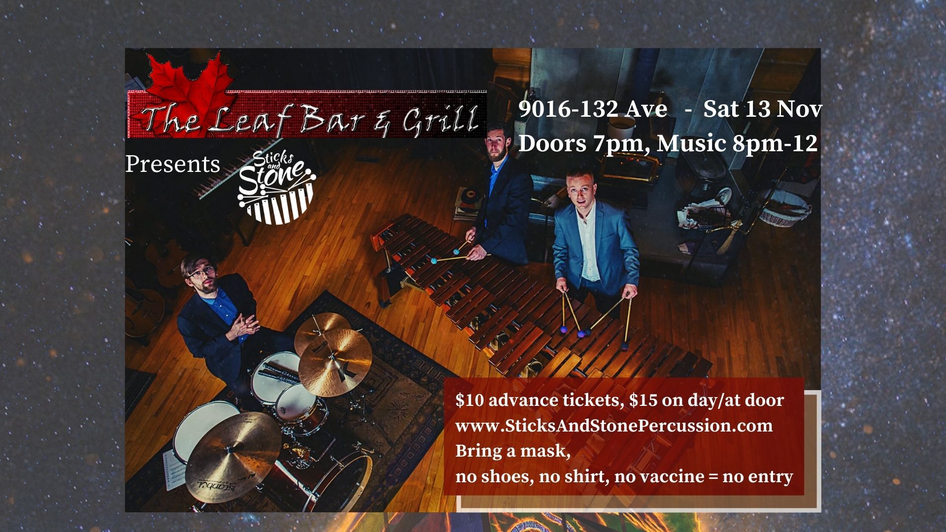 Looking for a fun night out? On 13 Nov 2021, grab your vaccinated friends and head to THE LEAF to enjoy an eclectic variety of rockin tunes you may know on some instruments you may not! Jayden Beaudoin (on a very blue vibraphone), Dale Osbaldeston (with some overly sophisticated drumming) and Stephen Stone (on marimba) will entertain with crowd favourites (hey, send your recommendations ASAP!) including music by the Red Hot Chili Peppers, White Stripes, AC/DC, Nirvana, Billy Joel, Snoop Dog and their already long-list of repertoire including world music, Disney, video-game and more. There will be high energy. There will be calm energy. There will be humour. There will be beauty. Doors open 7pm, Music is from 8-12. $10 through Nov 12 (closing online). $15 Nov 13th at the door. The Leaf Bar and Grill 9016-132 Ave, Edmonton Ab Pin Drop: https://goo.gl/maps/5ouvKLk1TzDedLiD9 Online Tickets (scroll down):