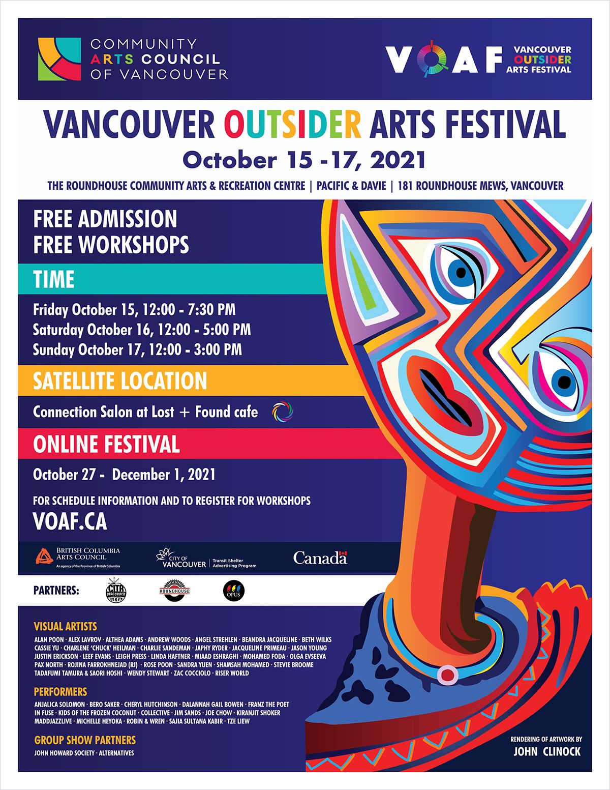The 2021 Vancouver Outsider Arts Festival features 3 days of dynamic programming at the Roundouse Community Centre. About this event Community Arts Council of Vancouver presents the annual Vancouver Outsider Arts Festival (VOAF) offering opportunities for exhibition, performance, connection and learning to visual and performing artists facing social exclusion and other barriers. VOAF is Canada’s first and only festival for Outsider Art, which is represented by significant fairs and museums globally. The artists may be self-taught or trained: they are all devoted to their creative practices, and come from a point of view that is outside the mainstream art world trends. Satellite Location: Connection Salon at Lost + Found Cafe at 33 W Hastings St, Vancouver. See Less Free Admissions Free Workshops Please read our Covid-19 Safety Plan: https://voaf.ca/covid-19-policy/
