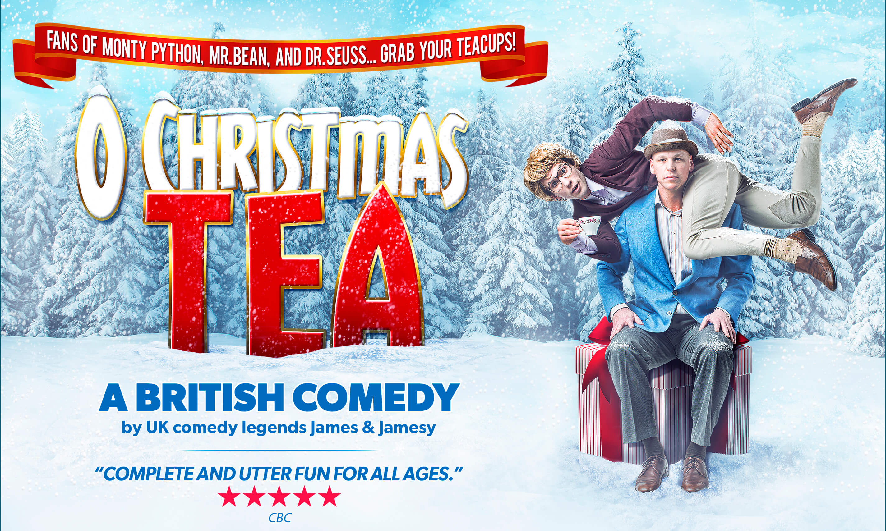 Fans of Monty Python, Mr. Bean, and Dr. Seuss… Grab your teacups! It’s time to reunite in-person and in laughter as Off-Broadway Comedians and London’s 3-time IMPRESARIO Award-Winners, James & Jamesy, bring their outrageously funny and brilliantly inventive Christmas comedy classic O Christmas Tea to Penticton for two performances — this is an astonishing show that delights thousands of hearts every holiday season. Get a taste of O Christmas Tea here: https://www.jamesandjamesy.com/glimpse-into-o-christmas-tea/ When catastrophe strikes at James and Jamesy’s Christmas tea party, flooding the world with tea, the friends leap into action, finding innovative and hilarious solutions to keep them afloat. Redefining immersive theatre, these masters of physical comedy—with over 20 comedy awards to their name—sweep the audience out to sea in a jolly aquatic escapade brimming with whimsy, action, and ingenuity in a celebration of friendship at Christmas. “Complete and utter fun… for all ages.” ★★★★★ CBC “Outrageously funny, magnificently written, beautifully choreographed.” ★★★★★ London Free Press “An ode to the idea that anything is possible.” ★★★★★ Torontoist “I cannot think of a show that will leave you more profoundly happy than this.” ★★★★★ Stage Door Toronto Hailed as “a child’s imagination on steroids” by London Free Press and “a masterpiece of physical comedy” by Theatre In London, critics rave for the charismatic James & Jamesy. A must-see performance on the international comedy circuit, the unstoppable duo, regarded as “one of the most popular fringe duos ever” (CBC), has been named Best of Fest (Orlando, Toronto, Winnipeg, Ottawa), Most Outstanding Show (London), Best Comedy (Victoria), Patrons’ Pick (London), among many other accolades.