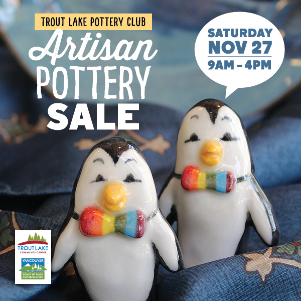 The Trout Lake Pottery Studio is hosting a one day holiday sale! Come early to find your new favourite handmade treasure crafted by our talented studio members. Get some of your holiday shopping done while supporting local makers. Also in attendance will be the Senior’s bake sale as well as the knitting club! Nov 27th 9am – 4pm