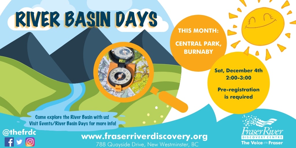 Usually held in the first half of every month, ‘River Basin Days’ is a series of outdoor public programs hosted by the Fraser River Discovery Centre, geared towards families. Join us at rotating locations around the Fraser River Basin as we explore this incredible watershed. Have you ever wondered how to use a compass, or how to read a map? Join us this weekend, December 4th, for an introduction to orienteering! Orienteering involves navigating a course using a map and compass and finding your way from checkpoint to checkpoint without getting lost. In this one-hour workshop, you’ll gain a basic understanding of map reading and compass use and practice your skills on our 1.25 km orienteering course. COVID-19 Safety protocols are in place, so please register in advance. Visit our website to learn more: https://fraserriverdiscovery.org/rbd/ — WHAT: River Basin Days in Central Park! • Play an orienteering game • Learn how to read a map and use a compass • Navigate a 1.25 km orienteering course WHEN: Saturday, December 4th, 2:00pm – 3:00pm WHERE: Central Park, Burnaby. Meet in the parking lot on the west side of the park, off Boundary Road. WHO: While everyone is welcome, this workshop is aimed at older children and their families.