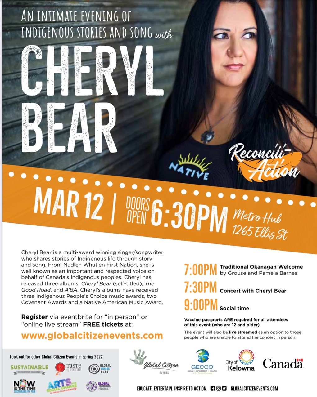 Join us for an intimate evening of Indigenous music, culture and song with award-winning musician Cheryl Bear. Cheryl is a multi-award winning singer/songwriter who shares stories of Indigenous life through story and song. She has released three albums: Cheryl Bear (self-titled), The Good Road, and A’BA. Cheryl’s albums have received three Indigenous People’s Choice music awards, two Covenant Awards and a Native American Music Award. Vaccine passports ARE required for everyone over 12 years of age to attend in-person. You do need to register for the Free Tickets. https://www.eventbrite.ca/e/cheryl-bear-concert-an-evening-of-indigenous-stories-and-songs-tickets-262823902367 Link to livestream Concert: https://www.globalcitizenevents.com/cheryl-bear