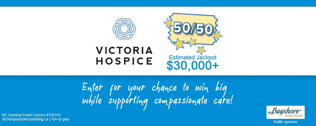 Ready, set, raffle! Win big while supporting compassionate care at Victoria Hospice! Tickets are now available for the 2022 Hike for Hospice 50/50 raffle. Sales are open until Sunday, May 1 at 10:30 am with the draw set for 11:30 am at Hike for Hospice at Fisherman’s Wharf Park. Come down to watch the draw live, or simply check online to see if you are the winner! Buy single tickets for $10, a three-pack for $25, 10 for $50 or 50 for $200. The anticipated jackpot is $30,000 with proceeds split between the raffle winner and Victoria Hospice. Whatever the amount, you’re a winner when you support Victoria Hospice patients and families. Big thanks to raffle sponsor Bayshore Home Health! Get your tickets now. Chances are 1 in 20,400 to win a prize. Actual odds depend on number of tickets sold. Know your limit, play within it. 19+ to play. BC Gaming Event Licence # 132155