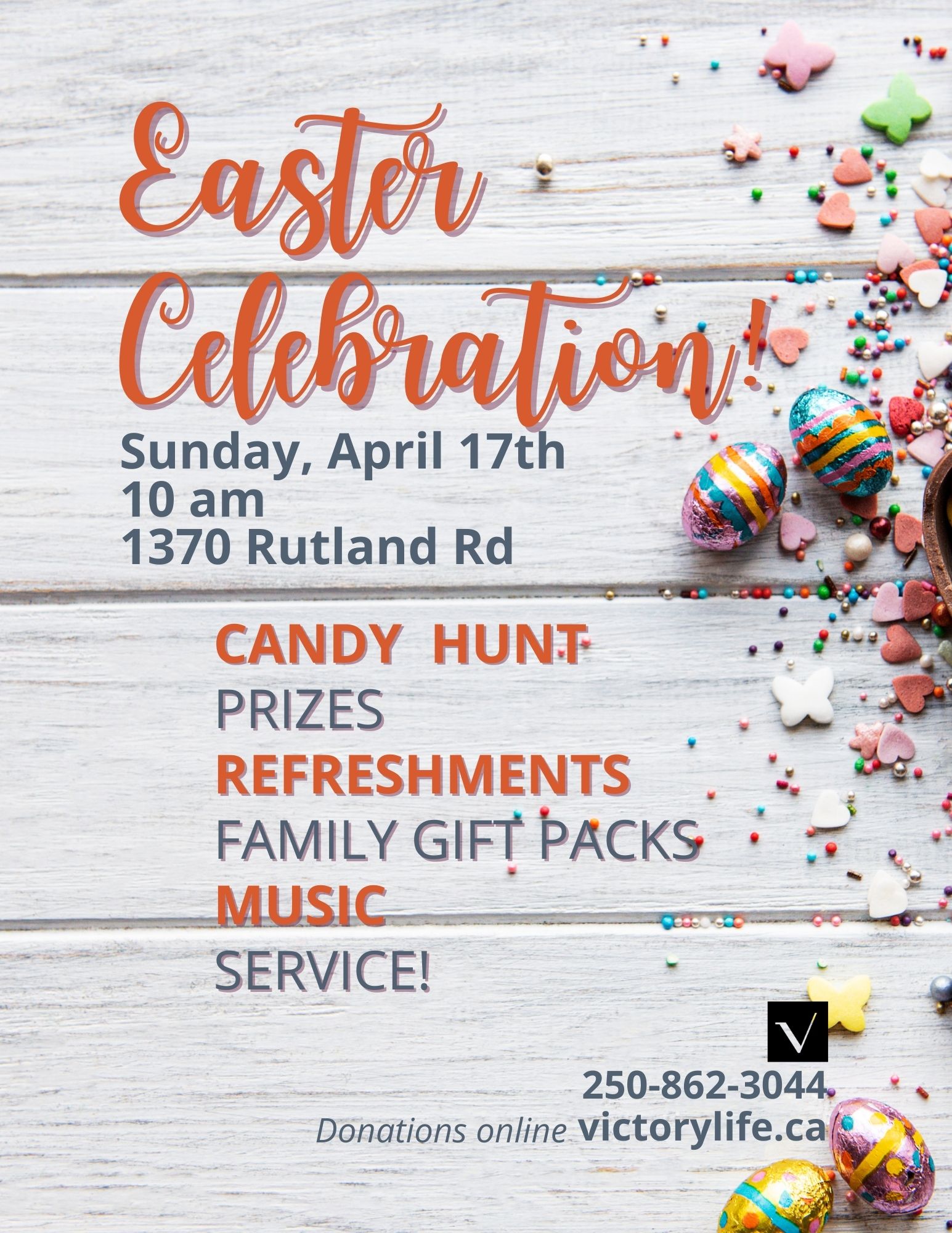 Want to celebrate the Easter season with the family? Join Victory Life as we celebrate Easter Sunday with a fun, kid friendly time! Candy Hunt, Prizes, Free Family Gift Packs, Refreshments, Music & More. It’s ALL free! For more info: 250-862-3044 or victorylife.ca