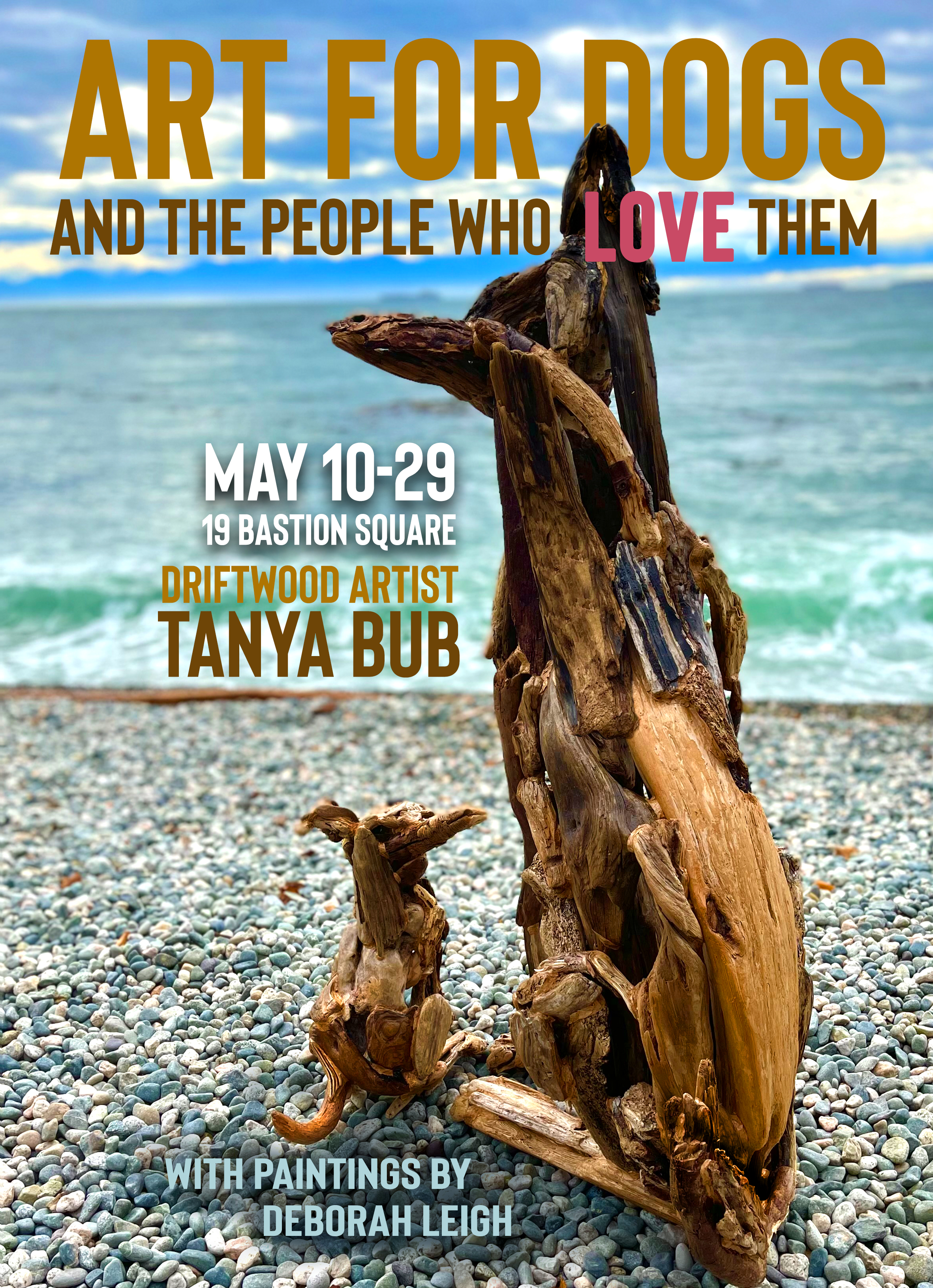 Local driftwood artist, Tanya Bub creates an “Art for Good” exhibit that is equal parts fundraiser, art and entertainment. The show runs May 10-29 at the Gage Gallery, 19 Bastion Square, Victoria. The idea for the show came from seeing dogs react to her canine themed sculptures. “They know it’s not real and yet some dogs have a very strong reaction to the art”. The surprising and delightful fact that some dogs like looking at art, just like people do, made her want to do something for dogs. “The SPCA is an amazing organization so I decided to donate 25% of my show proceeds to them”. The show will feature outdoor sculptures of dogs for both dogs and people. People are encouraged to take and share photos of their dogs reacting to the art. Indoors (people only) there will be a “Dog Park” display made up of 30 or so miniature sculptures depicting people and dogs at play, an “Air Dog” series with life-sized sculptures of dogs in action (catching frisbees, leaning out of car windows, etc.), life-sized driftwood portraits of hard-to-place dogs currently at the SPCA, collage pet portraits, sculptures of wildlife and much more. Everyone is invited to opening night on May 12 from 5-8pm for complementary appetizers and a glass of beer or wine. There will be a presentation by the SPCA (with two rescue dogs), an “Ask the Vet Anything” with Joanna Piercy and a presentation about a proposed real dog park by the Victoria Downtown Residence Association. See Tanya Bub’s sculptures at http://tanyabub.myportfolio.com or on Instagram @victoriadrifter.