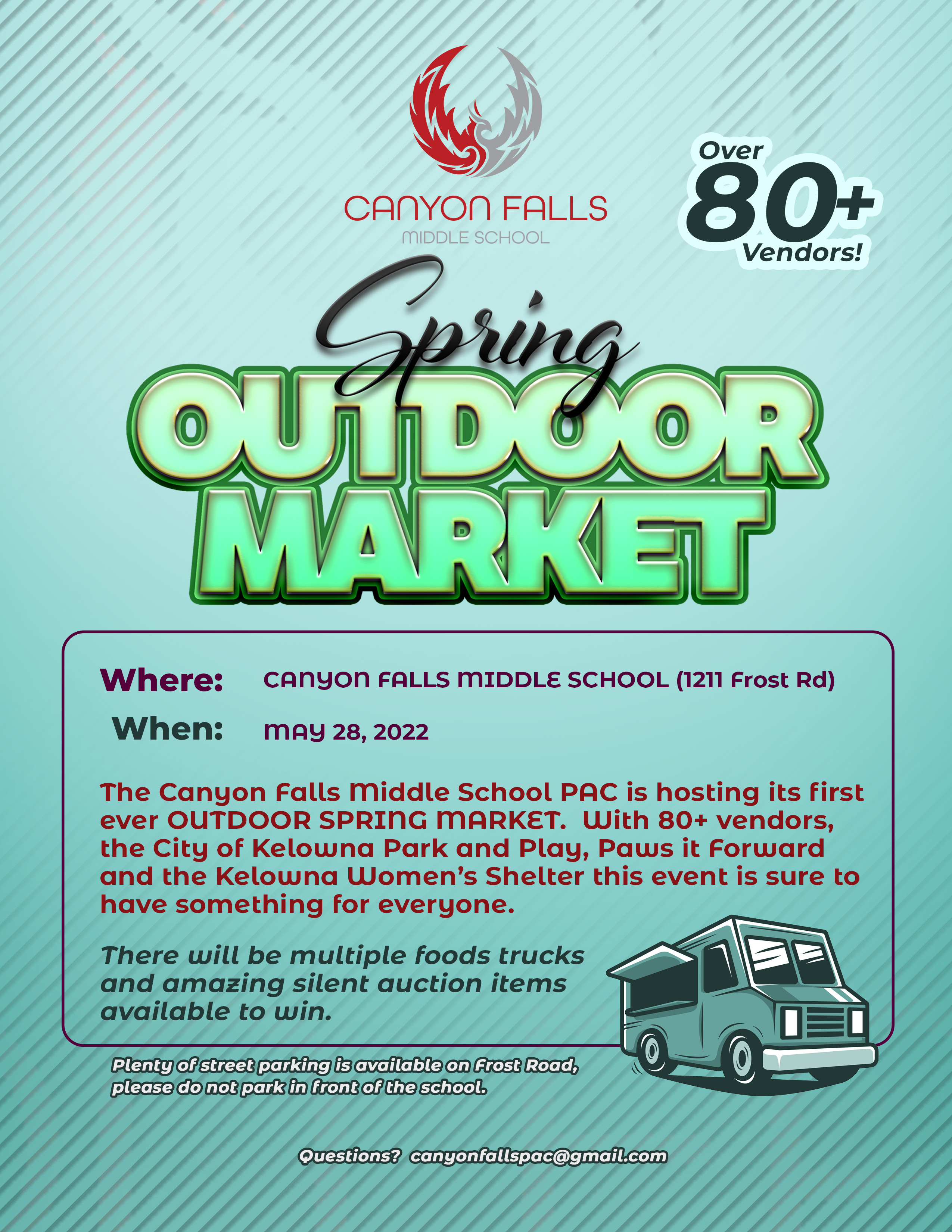 The Canyon Falls Middle School PAC is hosting its first ever OUTDOOR SPRING MARKET. With 80+ vendors, the City of Kelowna Park and Play, Paws it Forward and the Kelowna Women’s Shelter this event is sure to have something for everyone! _________________________________________________ Our inaugural Canyon Falls Middle School Spring Outdoor Market will be setup in the front of the school on May 28th from 10 am – 4pm. • This is a fundraiser for Canyon Falls Middle School with Kelowna Women’s Shelter selected to share in a 10% of net proceeds from the day. • We will have 80+ vendors, including some student entrepreneurs from Canyon Falls Middle School. • City of Kelowna will be setting up their Park n Play activities in the school field. • Paws it Forward, Kelowna Women’s Shelter and Childhood Connections will also be joining us • There will be a few local food trucks serving up tasty treats. • We will have a silent auction with incredible items donated by many local businesses and CMS Families. • There also might be a few entertainment surprises throughout the day as well. • Entrance to the market will be by donation and you will receive a door prize entry form.
