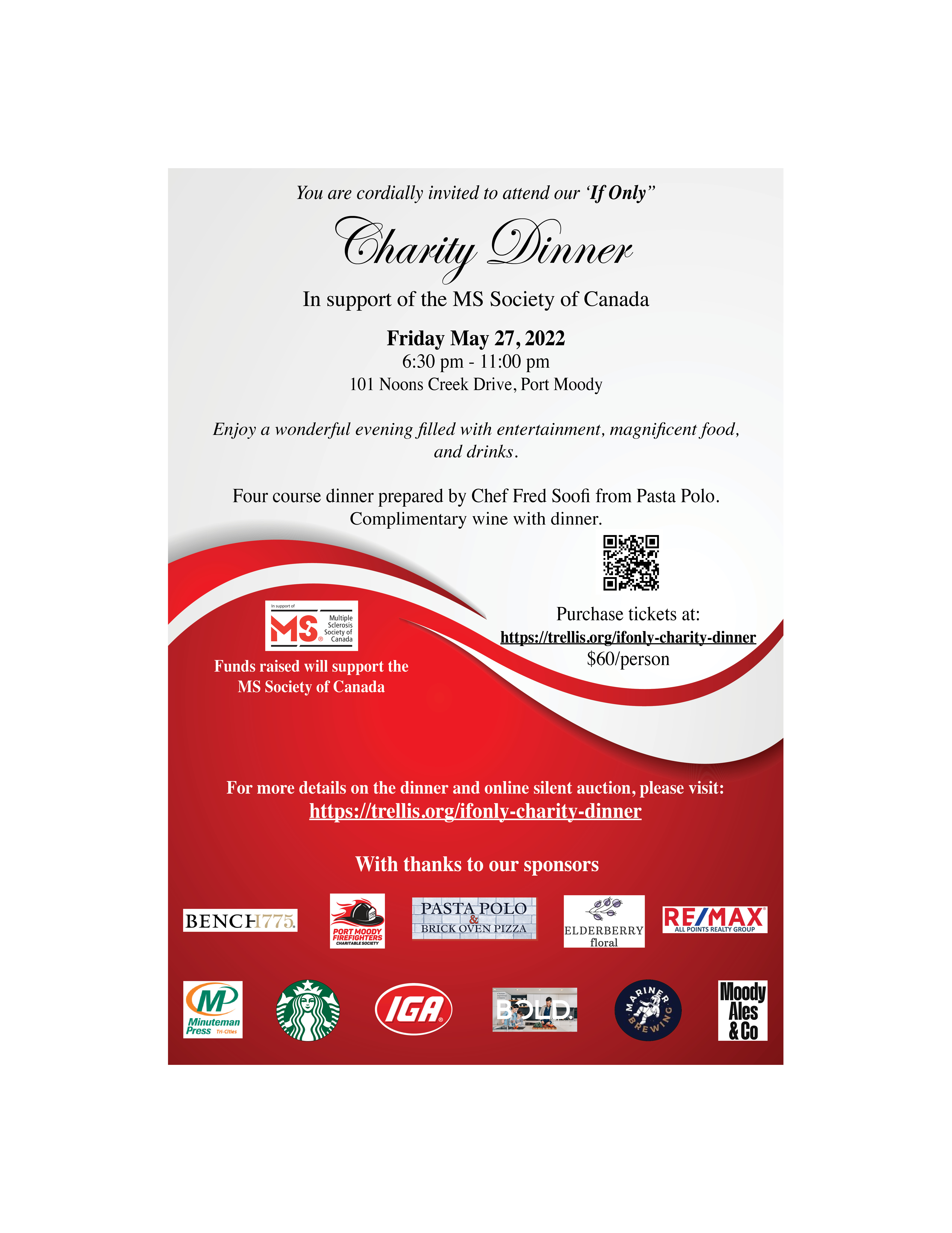 Welcome to our first ‘If Only’ Charity Fundraiser in support of the MS Society of Canada. We hope you will join us and enjoy a wonderful evening filled with magnificent food and drinks. Complimentary wine with dinner. https://trellis.org/ifonly-charity-dinner In addition to a fantastic in person dinner, check out our online silent auction, open from May 12th until May 27th at 10PM.