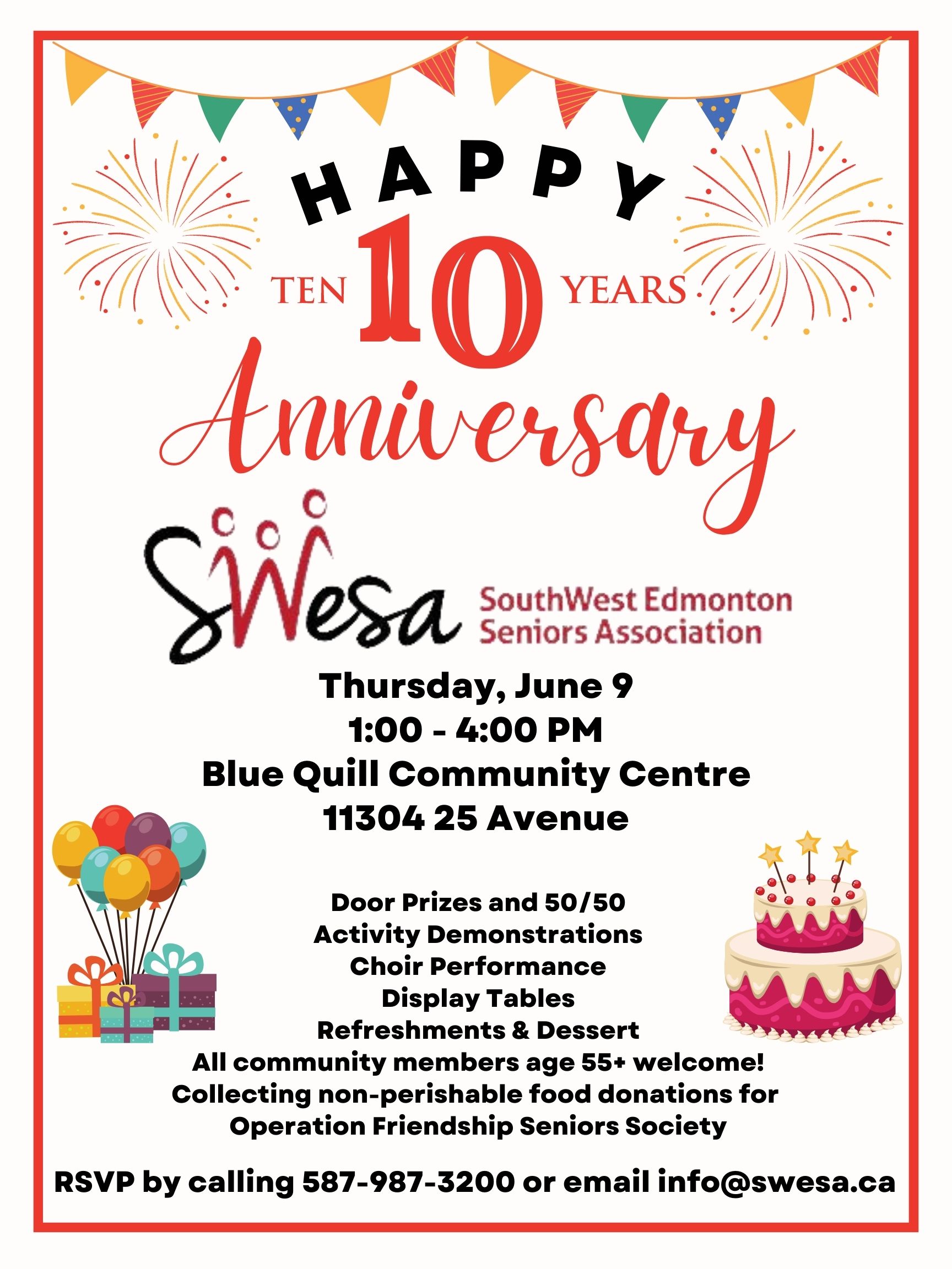 Join us on Thursday, June 9, 2022 from 1:00 – 4:00 pm at the Blue Quill Community Centre at 11304 25 Avenue to celebrate SWESA turning 10! The SouthWest Edmonton Seniors Association is the youngest seniors association in Edmonton, but we have grown and thrived through some challenging times! We are celebrating our 10th Anniversary with display tables, activity demonstrations, draw prizes, 50/50, music, refreshments and dessert. Our ceremony will celebrate our past and look forward to our next 10 years with words from elected officials. All community members 55+ welcome!
