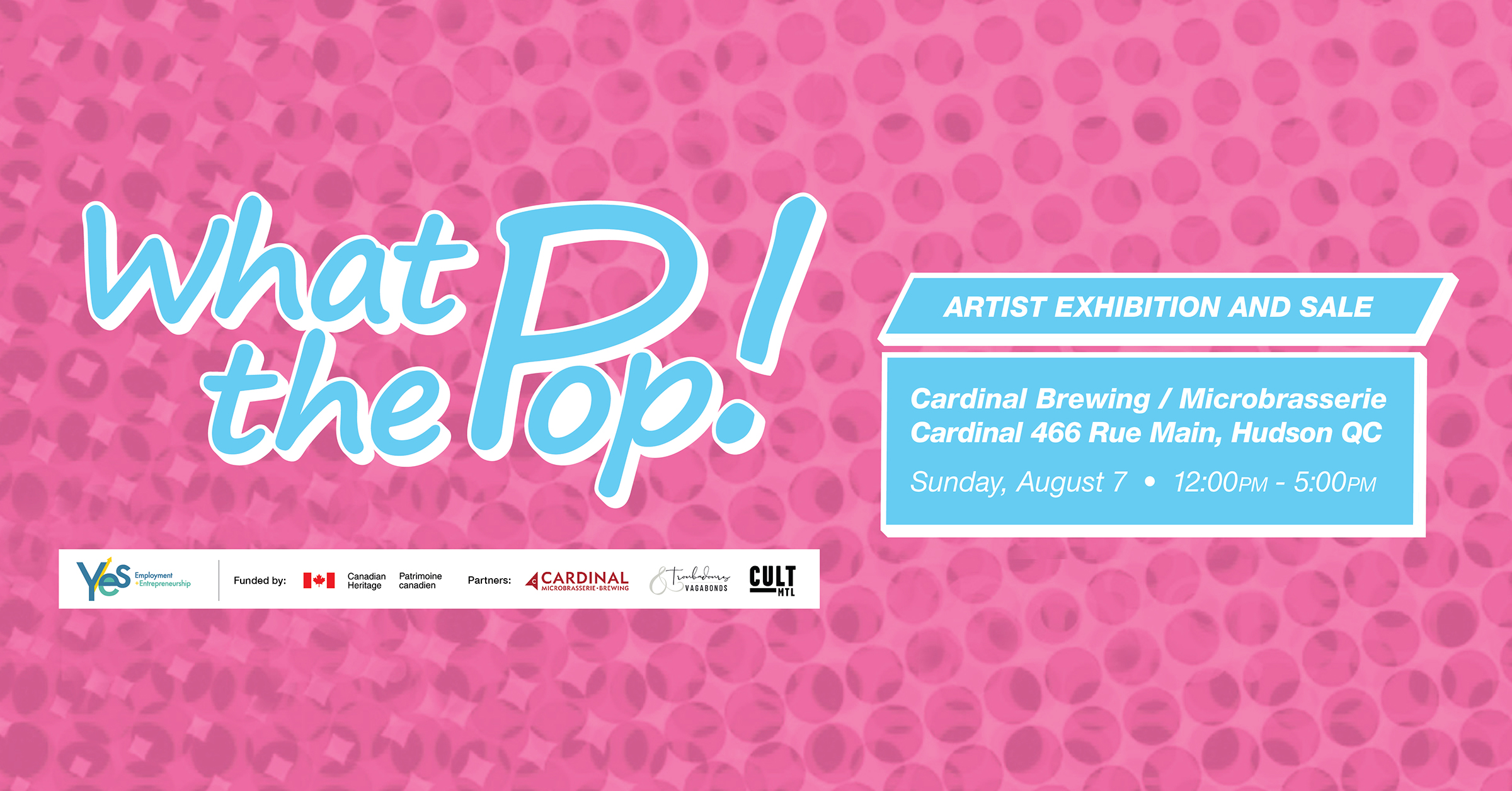 Free event. Open to the public. We are excited to announce the event details for What the Pop! 2022 which features artists working across the visual, literary, and performing arts. Throughout the months of August and September, over 50 talented, emerging artists from across Quebec will present their work to the public, outdoors, both on the street and on the stage. These events are free and open to the public. You will also be able to view the art and find out more about the artists in our virtual exhibition gallery coming soon… Come support your local arts scene in-person or from home! Here is the list of artists who will be participating in the 2022 edition of What the Pop! Sunday, August 7, 2022 | 12:00PM-5:00PM Cardinal Brewing | 466 Rue Main, Hudson, Quebec J0P 1H0 MALM Hania Souleiman Naomi Lane Mirella Bacco Sandra Woods Viktoriia Lykhachova 2a3d Marie Jose Gelinas Kristen Collett Jewelry Christian Henegan-Comeau Tonya Cattan Yazid Bounouar Learn more about the artists here >>> https://bit.ly/3AY0cch