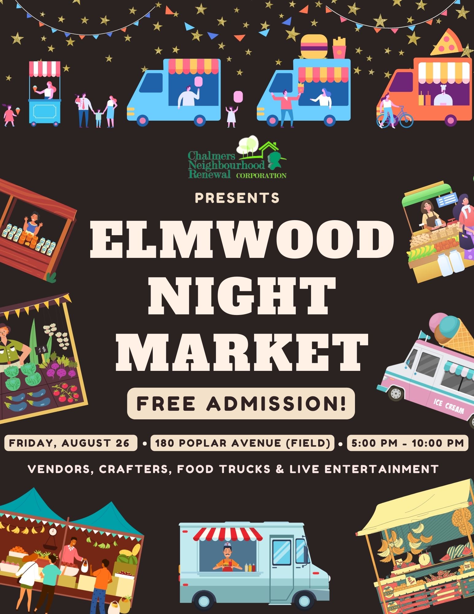 We are thrilled to invite you to the first ever Elmwood Night Market! The Elmwood Night Market will take place on Friday, August 26th from 5:00 p.m.- 10:00 p.m. on 180 Poplar Avenue (Field). We will be hosting a wide variety of unique, and creative vendors where attendees can expect to meet local artisans, local artists, and enjoy some live music! So come out and end the summer with a bang! Please note: While we love our furry friends, please leave them at home for this event (unless a service dog).
