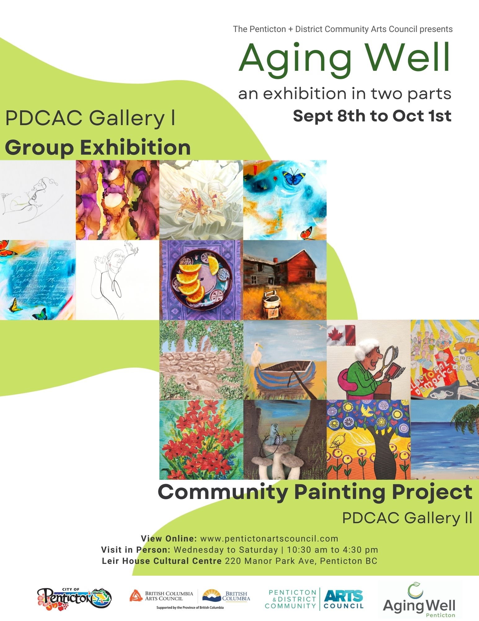 The Penticton & District Community Arts Council has invited senior (55+) to exhibit their own expression of what aging well means to them, an opportunity to reflect on their past as well as their vision for the future, for this two-part exhibition. Gallery I features a group exhibition from an open call for participants. Pottery, oil, watercolour, mixed media, and more. Participating artists range from emerging artists to seasoned professionals. Gallery II features paintings created during the community painting drop-in events with Alice Strohmaier. Alice led several events from May to August, in Penticton & Kaleden, where participants were given a 10×10” canvas panel and the same set of acrylic paints to work with while creating what aging well means to them. Gallery Hours: Wednesdays to Saturdays, 10:30 am to 4:30 pm PDCAC Galleries at the Leir House Cultural Centre: 220 Manor Park Ave, Penticton http://www.pentictonartscouncil.com