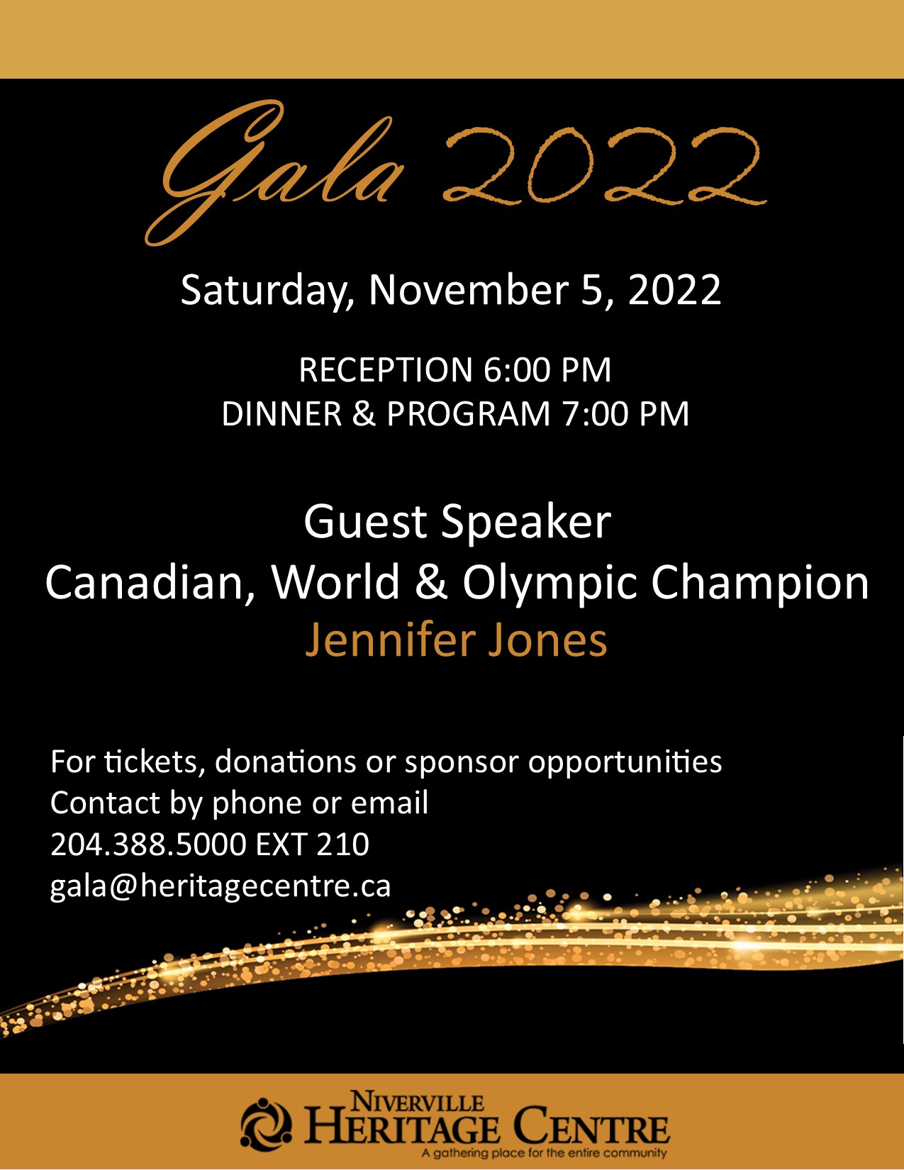 The Niverville Heritage Centre Campus is an important part of the community and supporting the residents that live on the Campus is fundamental to what we do. This Campus is their home. This Campus also brings the community together with many different services, from pharmacy, dentist, medical clinic, hair salon including an event centre and restaurant. As a community, it is great to come together to support the residents on this Campus so they continue to enjoy this place they call home. After missing two years, we are excited to be able to plan our Annual Fundraising Gala evening with dinner and special speaker happening November 5, 2022. This year we are thrilled that our special guest speaker will be Canadian, World & Olympic Champion Curler, Jennifer Jones. This year the funds raised will be going to the following projects. These projects are listed in order of priority. What that means is that if we do not raise our goal of $59,500.00 then we will go as far as the funds raised will reach. Projects Manor – Hand Rails $2,000.00 Manor – Hallway Carpet $25,300.00 Manor – Automatic Door in Family Room $5,000.00 PCH – Resident Sit/Stand Chair $9,000.00 PCH – 1st & 2nd Floor Tables $9,500.00 PCH – Dining Chairs in Great Room $7,500.00 Manor – Two Sound Systems for Cafe and Family Room $1,200.00 For tickets, donations or sponsor opportunities Contact by phone or email 204.388.5000 EXT 210 gala@heritagecentre.ca