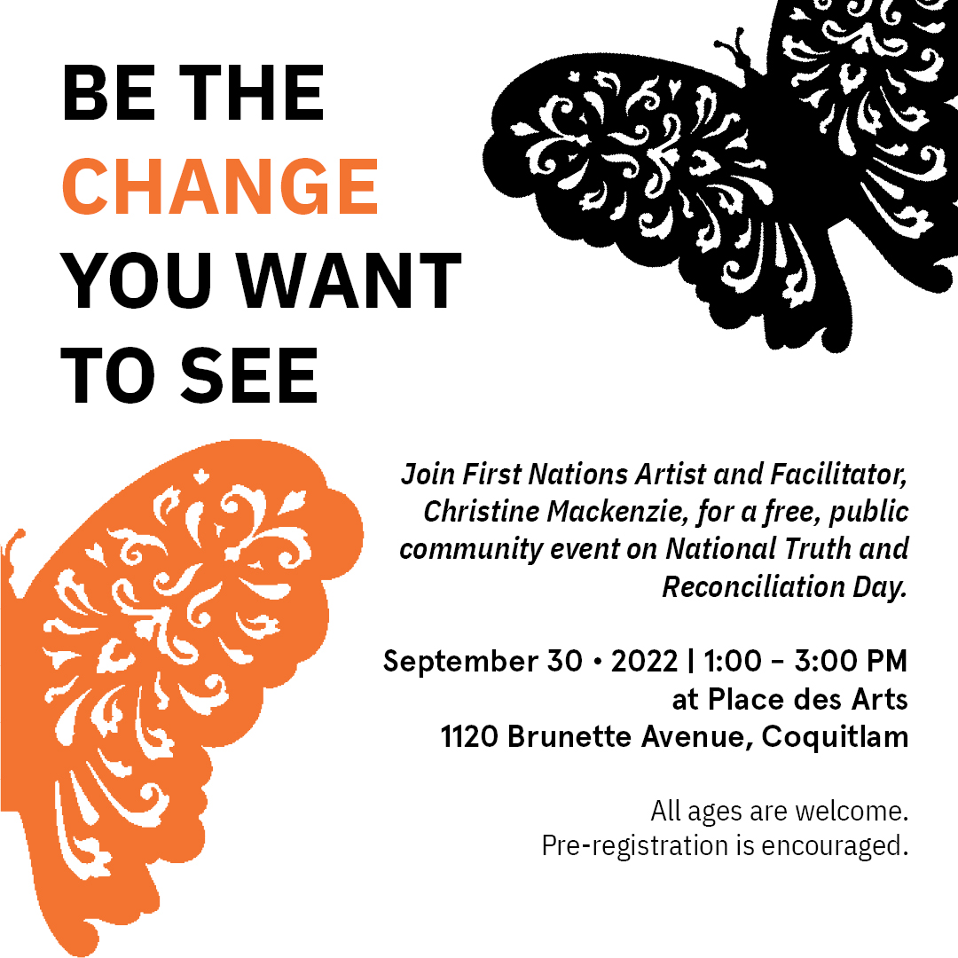 Join First Nations Artist and Facilitator, Christine Mackenzie, for a free, public community event on National Truth and Reconciliation Day. We are all at different points in our journey learning about Indigenous history and current issues that many communities still face. Whether we come from a space of healing or understanding, we can benefit from coming together with members of our community to expand our knowledge. During this workshop, you’ll learn from Christine in an uplifting environment and help colour in parts of a butterfly’s life cycle. Attendees will be able to choose which stage of the life cycle they would like to colour and what medium they would like to use. The butterfly represents change and growth, which reflects the journey of Truth and Reconciliation. All ages are welcome. Pre-registration is encouraged.