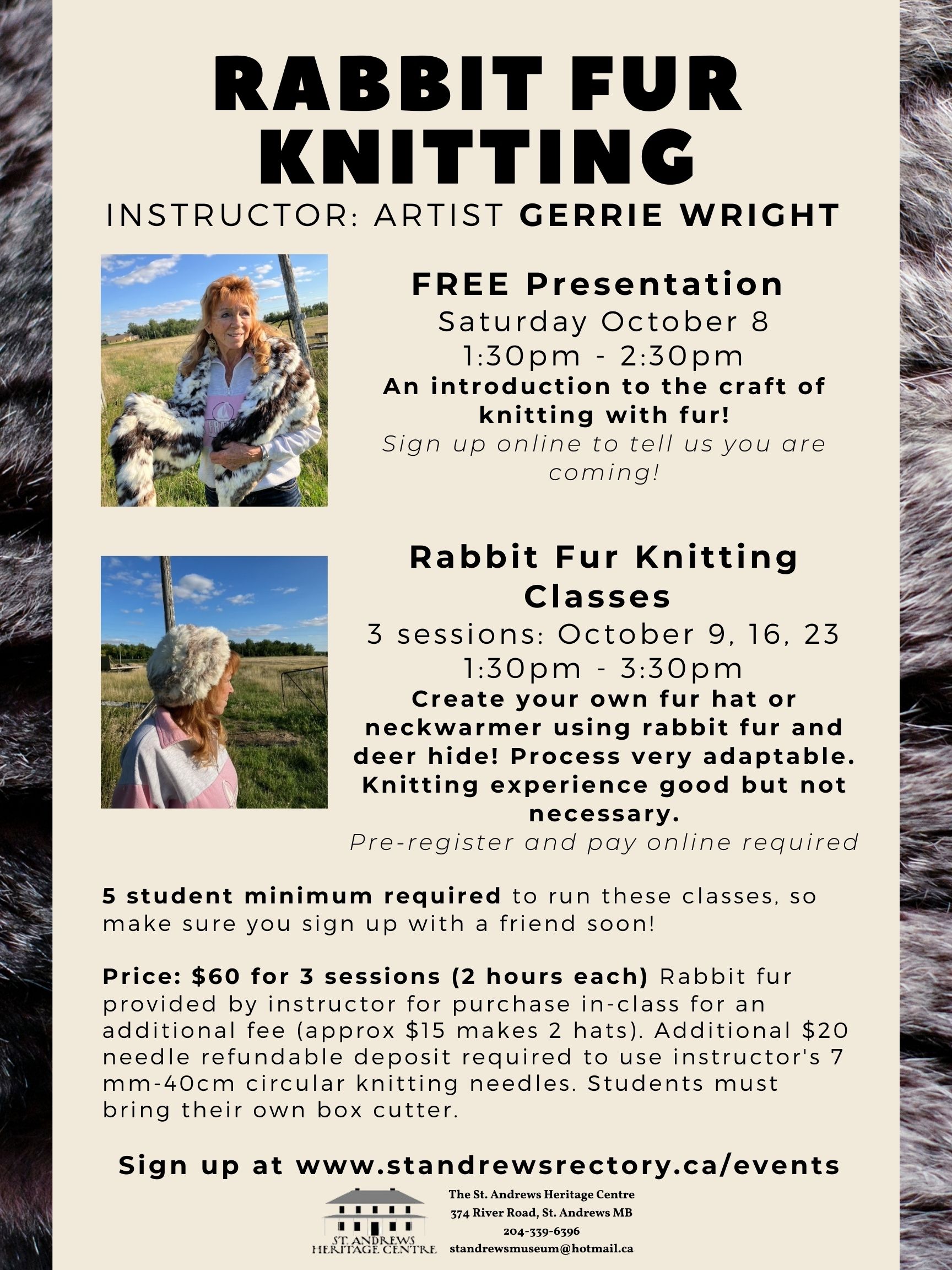 Create your own fur hat or neckwarmer using rabbit fur and deer hide! Process very adaptable. Knitting experience good but not necessary. Instructor: Gerri Wright 3 sessions: October 9, 16, 23 1:30pm – 3:30pm 5 student minimum required to run these classes, so make sure you sign up with a friend soon! Price: $60 for 3 sessions (2 hours each) Rabbit fur provided by instructor for purchase in-class for an additional fee (approx $15 makes 2 hats). Additional $20 needle refundable deposit required to use instructor’s 7 mm – 40cm circular knitting needles. Students must bring their own box cutter. Online registration and payment is required.