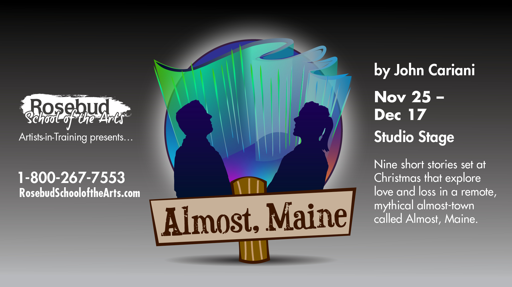Rosebud School of the Arts Artists-in-Training presents Almost Maine by John Cariani. On a cold clear moonless night in the middle of winter all is not quite what it seems in the remote mythical almost-town of Almost Maine. As the northern lights hover in the star-filled sky above Almost’s residents find themselves falling in and out of love in unexpected and often hilarious ways. Knees are bruised. Hearts are broken. But the bruises heal and the hearts mend –almost in this delightful midwinter night’s dream. Almost Maine tells nine short stories set at Christmas explore love and loss. Check-in for all Studio Stage performances at the West-side of town behind the Church. Doors open 30 minutes prior to show-time and no admission will be allowed once the performance starts. Running Time: 90 minutes Almost Maine plays November 25 to December 17 at 4:30pm! Ticket Prices: Adults (show only): $25 Adults (show & buffet): $59 (Fridays & Saturdays) Youth/Students (show only): $15 Youth/Students (show & buffet): $49 (Fridays & Saturdays) To Book Tickets call 1-800-267-7553!