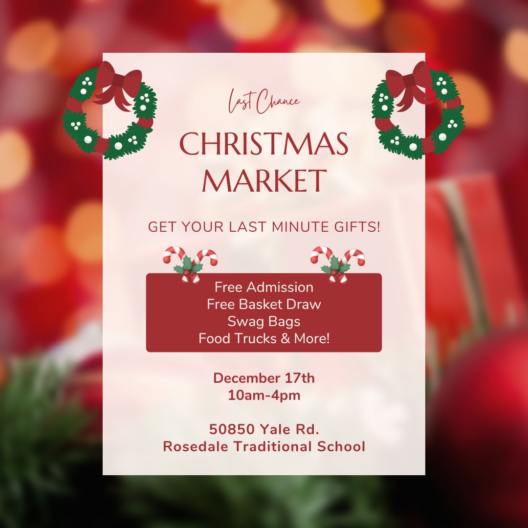 ππDONβT MISS OUT ππ Come on out to the βLast Chance Christmas Market” on Saturday, December 17th from 10am to 4pm at the Rosedale Traditional School located at 50850 Yale Rd in Rosedale and get all your final gifts for the people on your list this year. Lots of Amazing Vendors π Free Admission ποΈ Free Basket Draw π« Free Swag Bags ποΈ for the first 30 people Great food trucks πππ₯€β Free Face Painting from 11am to 2pm π We will also be having a special guest joining us from 12pm to 2pm that we will announce soon, so keep an eye out for that π Itβs going to be a lot of fun so make sure you come on out and share with all your family & friends and get your holiday shopping finished off π