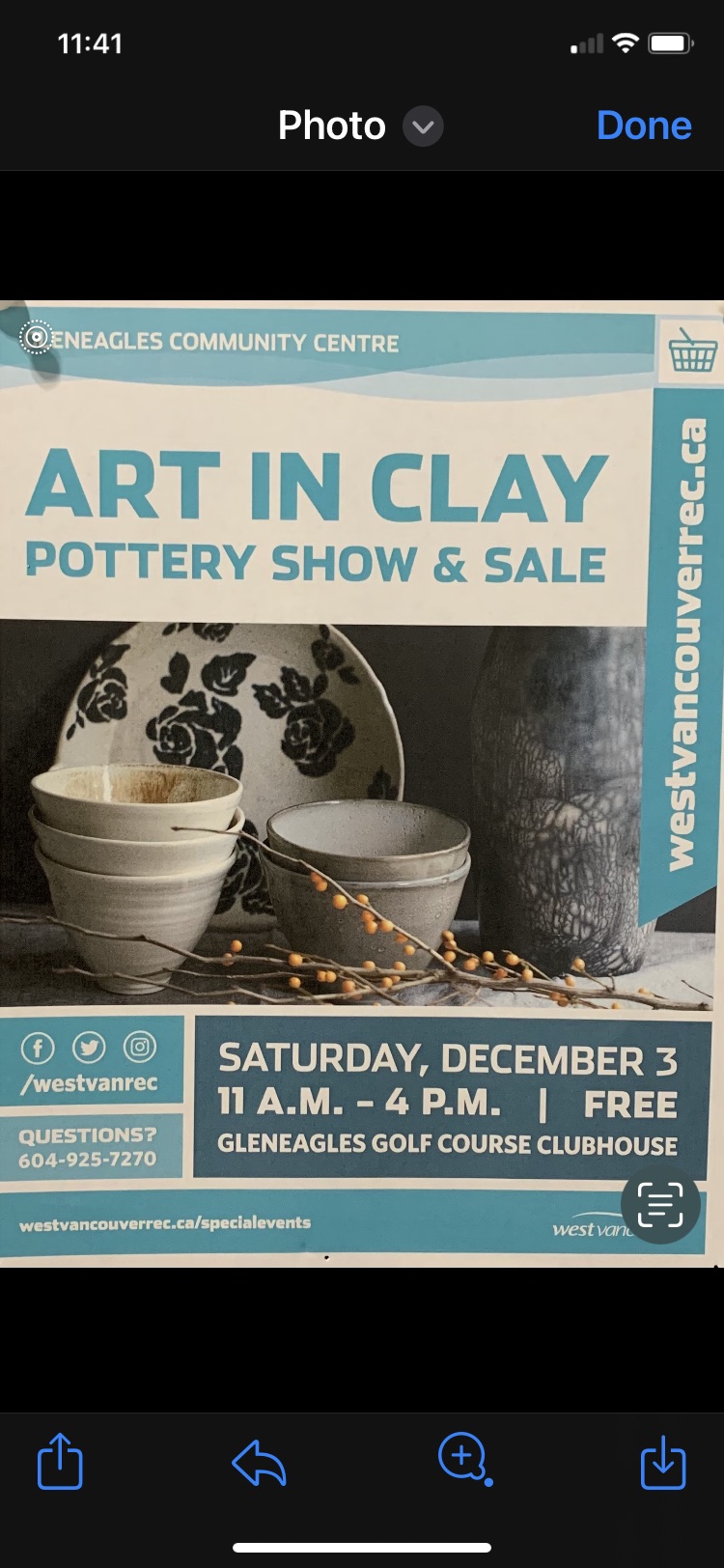 The potters at the Gleneagles Community Centre annually have a Christmas sale, held at the Gleneagles Golf Course, Horseshoe Bay. This talented group features functional ceramics as well as many artistic expressions. For more detailed information, please contact Ronna Anders @ 604-921-2119