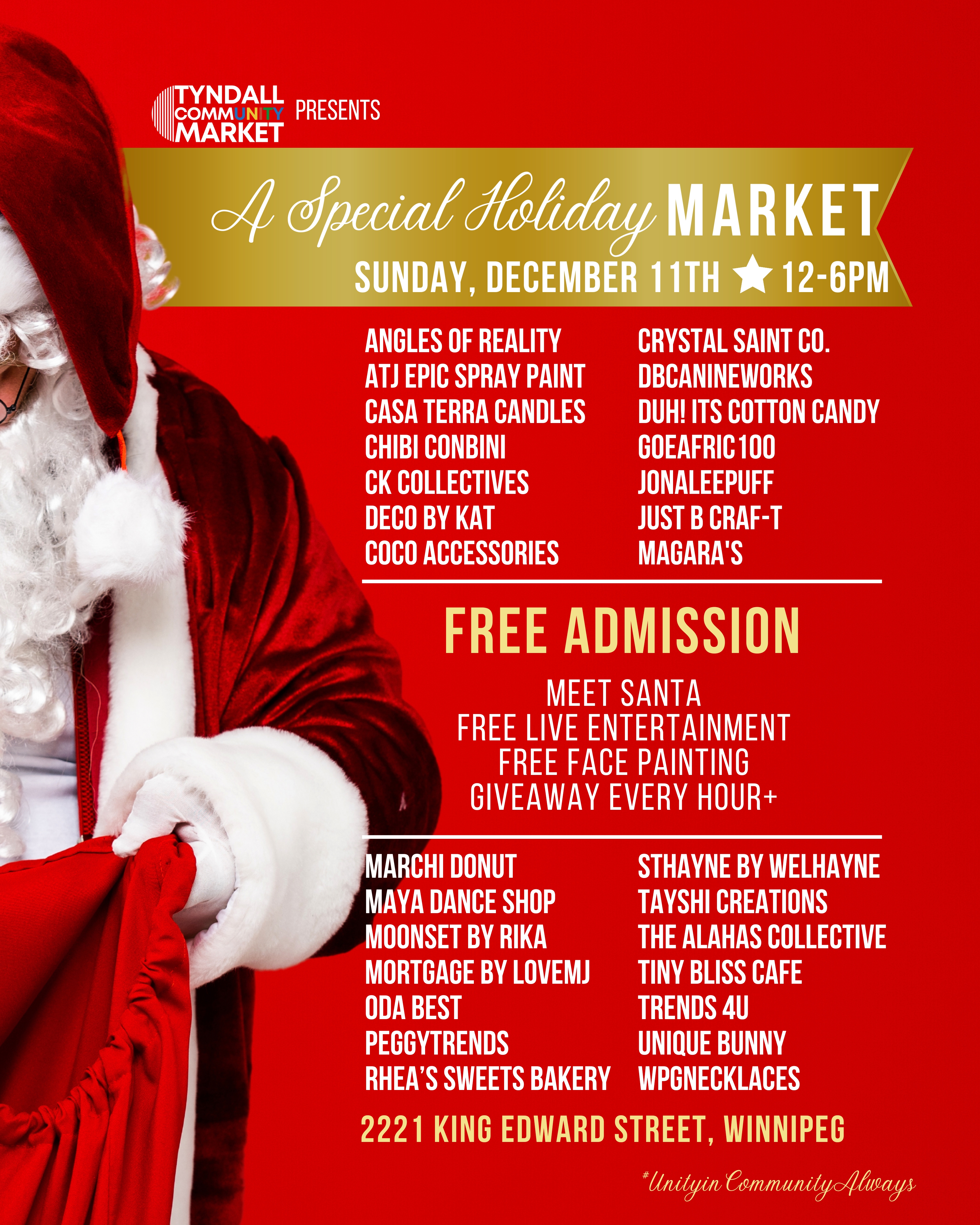 On December 11th, join us for A Special Holiday Market presented by Tyndall Community Market (TCM)! Support your local vendors and enjoy: 🔵FREE admission 🔵FREE live entertainment featuring local artists 🔵FREE face painting 🔵FREE MEET & Take a Selfie with SANTA 🔵FREE parking 🔵Giveaway every hour + MORE! Your chance for last-minute holiday shopping! Bring your whole family & experience the warmth of the holidays at Tyndall Community Market. Time: 12pm – 6pm Tyndall Park Community School Hall, 2221 King Edward St., Winnipeg. Entrance by the playground. ***TCM is proud to support Bear Clan Patrol Northwest; please help and support their NorthWest Project Bundle-Up. We will be collecting donations of non-perishable goods and new/gently used winter clothing and accessories on-site at the market.