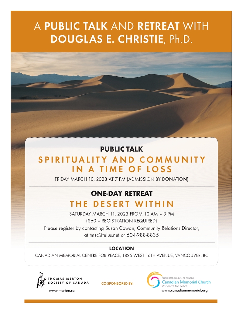 PUBLIC TALK “Spirituality and Community in a Time of Loss” Friday, March 10, 2023 at 7 pm Canadian Memorial Centre for Peace 1825 West 16th Ave. in Vancouver By donation at the door Doug Christie will examine the place of darkness in our lives and ask what it can mean for us to enter and inhabit this vast space of unknowing and discover there not simply bewilderment but something Thomas Merton called “the hidden ground of love.” Douglas E. Christie, Ph.D., is Professor of Theological Studies at Loyola Marymount University in Los Angeles. A long-time Merton scholar, Doug’s most recent book, The Insurmountable Darkness of Love: Mysticism, Loss and the Common Life (Oxford) was published in 2022. Doug is founding editor of the journal Spiritus. Co-sponsored by the Thomas Merton Society of Canada and Canadian Memorial United Church and Centre for Peace.