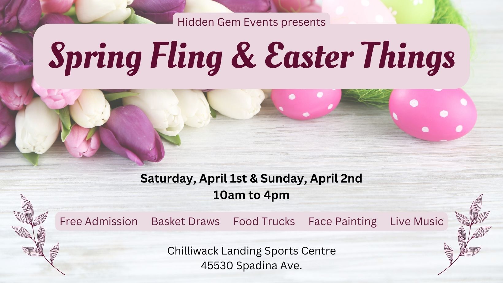 🌷🌷MARK YOUR CALENDAR!! 🌷🌷 Welcome to Hidden Gem Events “Spring Fling & Easter Things” Market. Come down to the Landing Sports Centre at 45530 Spadina Ave., in Chilliwack on April 1st and April 2nd from 10am to 4pm both days and check out all the great vendors that will be on hand!! Free Admission, Food Trucks, Live Music, Free Swag Bags for Early Birds & Much More!! Free entry for the Basket Draws filled with items from our wonderful vendors. Free Face Painting, Coloring Contest for the Kids to win their own Basket!! Special Guest Alert!! Keep an eye out for more information on times Come and Support Local Businesses ☺️