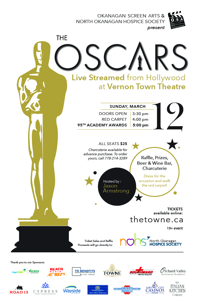 It might be the next best thing to being there – the 95th Academy Awards will be live streamed at Vernon’s Towne Theatre on March 12. The North Okanagan Hospice Society will host the fun-filled night and encourages attendees to dress as their favourite Hollywood star or dress up in Oscar-worthy attire and walk the red carpet. “This is a fun night out, that we have been part of in the past. To be able to partner with the Okanagan Screen Arts Society to present this fundraiser is exciting, and we can all walk the red carpet, take photos, win prizes and raffles and watch Hollywood’s biggest event of the year on the big screen, it should be magical,” says NOHS executive director Lisa Matthews. Last year’s Oscar event at the Towne was cancelled after a fire in the basement beside the theatre shut the facility down for months. This year’s fundraiser will start with a bubbly reception, and will be hosted by local movie critic Jason Armstrong (The Aisle Seat). The Oscars broadcast will be hosted by comedian Jimmy Kimmel. Tickets for the event are $25 each and can be purchased on the Towne Theatre website.
