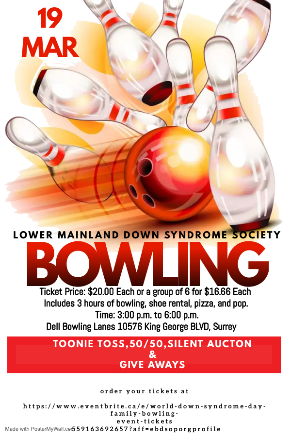This is a family bowling event to celebrate World Down Syndrome Day. We encourage families to dress in yellow & blue, wear crazy socks, etc. to show your spirit. There will be a Toonie toss,50/50 draws, silent auction, and giveaways. Tickets can be purchased at Eventbrite https://www.eventbrite.ca/e/world-down-syndrome-day-family-bowling-event-tickets-559163692657