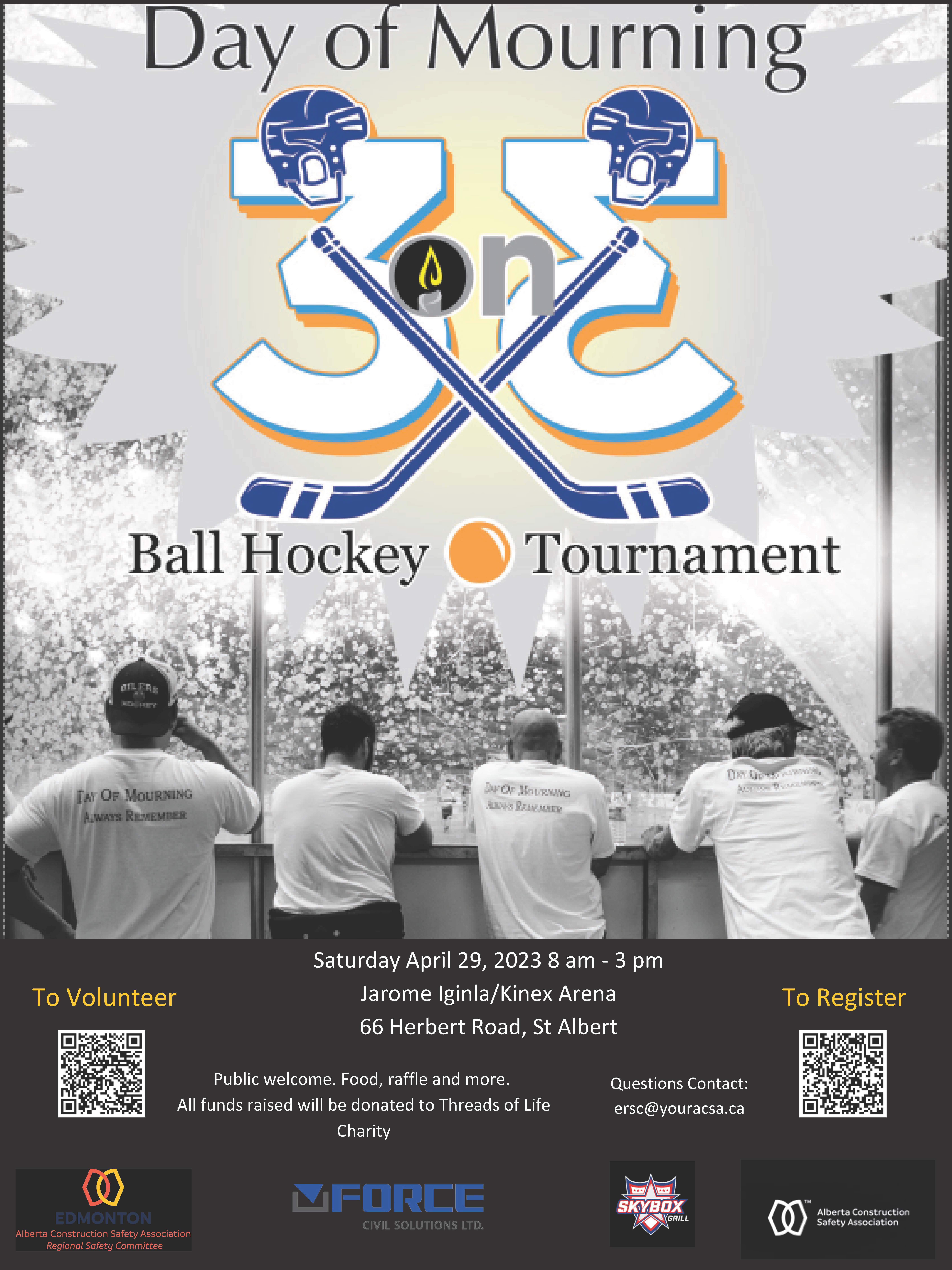 Every year on April 28 we pay our respects to, and remember, the workers who have been killed, injured or suffered illness as a result of work-related incidents. Sadly, Alberta lost 178 people to workplace injury or illness in 2021. On April 29th, 2023 The Edmonton Regional Safety Committee will be hosting a ball hockey tournament at the Kinex/Jerome Iginla areas in St. Albert. All funds raised will be donated to the Threads of Life – Association for Workplace Tragedy Family Support. Space is limited to 20 teams (18+). Registration fee of $120/team; registration deadline is April 12th. Full concession, children’s activities, raffle, 50/50 and swag bags for all participants. QR code will take you straight to the registration page, or email us directly. Register today to support this amazing cause!