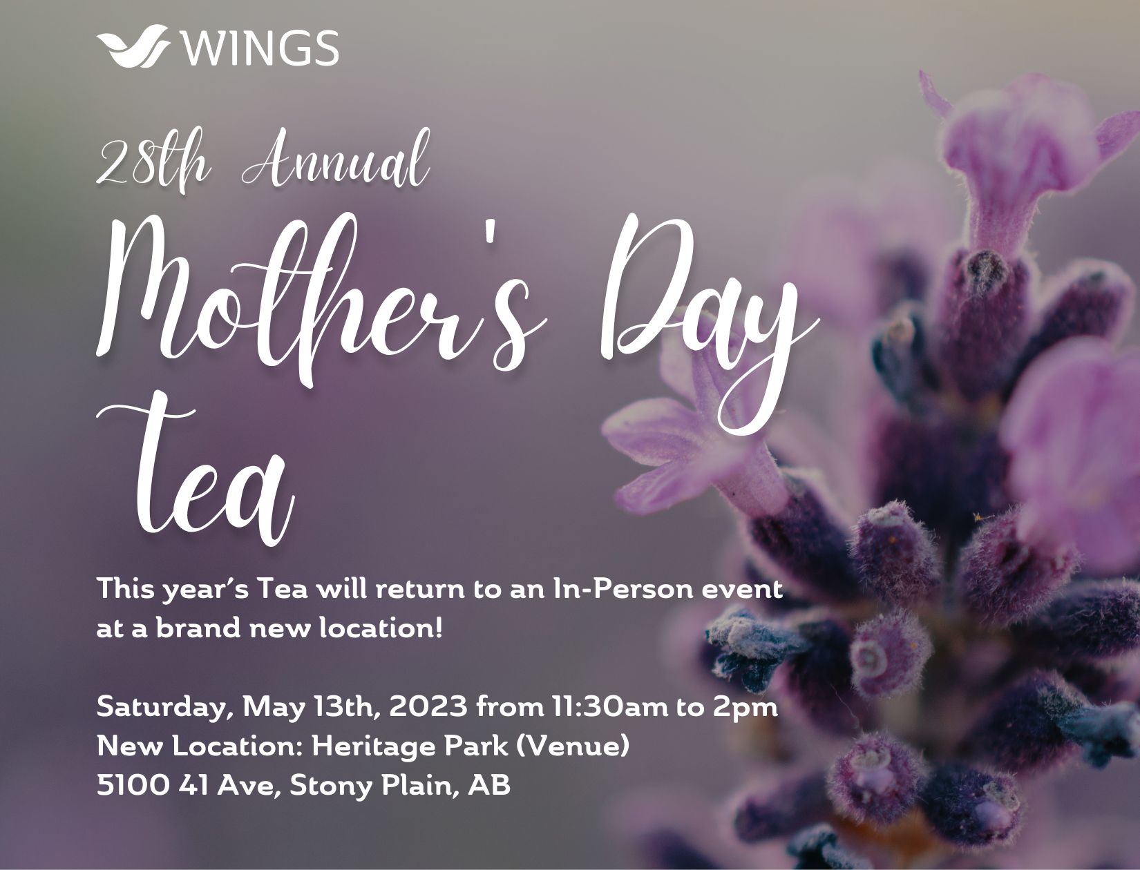 We cordially invite you to attend WINGS’ 28th Annual Mother’s Day Tea! This year’s Tea will return to an In-Person event at a brand-new location: Date: Saturday May 13th, 11:30am to 2pm (Doors open at 11am) New Location: Heritage Park (Venue) in Stony Plain, AB –5100 41 Ave, Stony Plain, AB– Tickets: $60 each ($30 Tax Deductible Receipt Issued), Table of 8: $480.00 TO PURCHASE TICKETS, OR FOR MORE INFO, GO TO: https://wingsofprovidence.ca/ All proceeds support WINGS’ programs, which provide hope and healing to women and children who have escaped domestic violence. Thank you for your support! This year’s Tea will include: -Catering by Upper Crust Café & Special Sweets from The Melting Pot -The lovely Victoria Anderson as Emcee -Entertainment from Musical Guests K4TGR4M! -Special Guest Speaker -Online Raffle Packages (rafflebox.ca) – available starting April 6th -Exclusive In-Person Only Raffle Packages! -50/50 -Door Prizes & more! Vegetarian and Gluten Free options available upon request! Contact Sarah at 780-426-4985 TO PURCHASE TICKETS, OR FOR MORE INFO, GO TO: https://wingsofprovidence.ca/ Thank you for your support!
