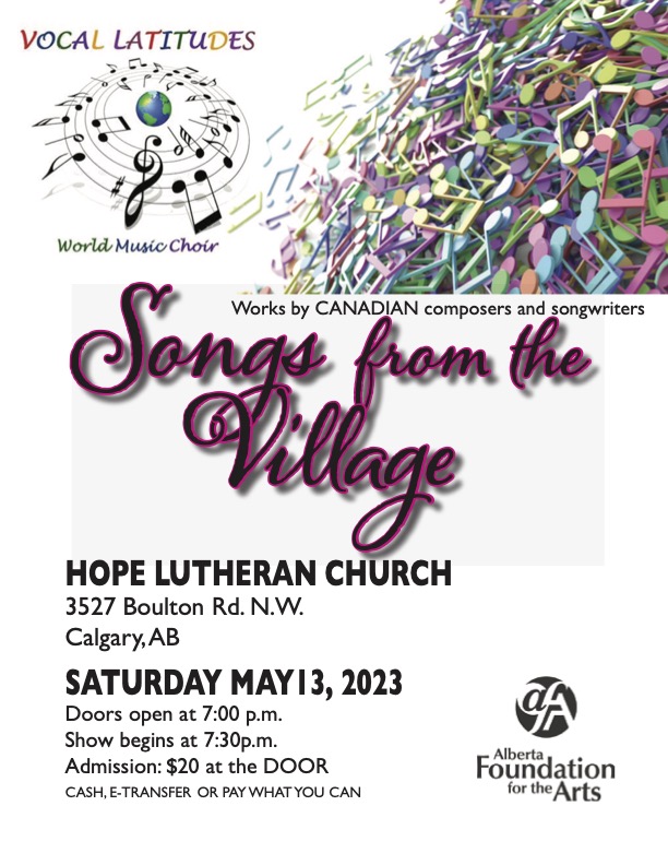 Vocal Latitudes World Music Choir presents, “Songs from the Village” (Kanata), Saturday, May 13, 2023 at 7:30 pm. at Hope Lutheran Church (3527 Boulton Rd. N.W.)