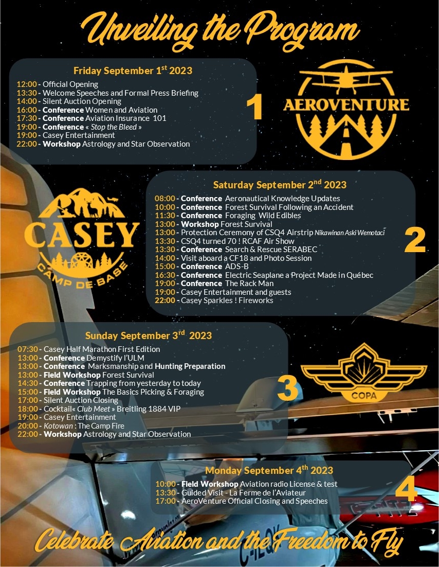 AeroVenture Casey 2023 Celebrate Aviation and the Freedom to Fly The biggest Aviation Event in Canada September 1 to 4, 2023 CASEY, QC – May 16, 2023. AeroVenture, presented by Camp de Base and Club Copa 217 is pleased to unveil its program for the 3rd Edition of the event, which will take place from September 1st to 4th on the military remains and the CSQ4 Airstrip in the Casey sector, in La Tuque. “Aviation and outdoor enthusiasts, an appointment not to be missed. Join the many visitors arriving from across Canada and the North Eastern of the United States. Whether you arrive from the air, by road or by train, just join us”, says Naor Cohen, promoter of the event. “I am very happy to join Naor Cohen’s team as honorary president of this 3rd edition. It is a very nice event that allows many people to discover one of the hidden treasures of La Tuque, in the Casey sector. Naor does a wonderful job with his team to welcome all participants and provide them with a memorable stay with us. I am more than delighted to support him in his efforts and I invite everyone to participate in the activities that will take place in September. The event is really worth the detour”, says Luc Martel, Mayor of La Tuque. “I am always part of the AeroVenture Event and each time I am impressed by the quality of the activities. Naor Cohen’s team is doing a wonderful job of raising awareness of Casey, which is a wonderful place for aviation enthusiasts to experience. The event continues to grow and is improving year after year. We are proud that this is happening on our territory”, says the Municipal Councilor for the District of Parent, Éric Chagnon. Did you know that Casey Airstrip turns 70 this year? To mark the 70 vestigious and military years of CSQ4 Airstrip, pilots from the Royal Canadian Air Force will fly over the site to commemorate its existence on September 2nd in the afternoon. It will also be possible to visit the interior of a CF18. Drumbeat: A Protection Ceremony will also be performed by an Atikamekw shaman to purify our Mother Earth. ‘Nikawinan Aski’. New! The First Edition of the Casey Half-Marathon will be held on Sunday, September 3rd, morning, organized by Naor Cohen, triathlete himself, founder and general manager of the Casey’s Base Camp. “An extraordinary journey! We’ve designed and tested a circuit that takes riders on a tour of Cold War remnants while enjoying nature. Four distances are offered. To encourage children under 12, registration is free. There will also be helicopter and plane tours (paying), an aeronautical exhibition as well as the AeroVenture Market”, adds Naor Cohen. A Great Premiere ! Casey is making broadcasting history! This year visitors will experience the opening of a new radio station for the duration of the event. AeroVenture 89.1 FM can be tuned directly to the CSQ4 event site. Live, interviews, program, informations everything will be there. Another great opportunity for visibility and national representation on the territory of the La Tuque Agglomeration! This is an on life time chance not to be missed! Casey is filled with stories and events that have marked the region, from the construction of a military base during the Cold War in the 1950s up to the events of the mercenary pilot, Raymond Boulanger. Lost in the middle of the forest, this trail has inestimable heritage and tourist value for the territory of the Parent district of the La Tuque Agglomeration and the Maurician region. Since 2012, a rather informal RVA has been organized and informally invited amateur pilots to a rather original annual activity, namely aerocamping on a mysterious vestige of the Cold War. AeroVenture was therefore born from this annual RVA. In 2022 AeroVenture Casey welcomed: 241 aircraft, 28 seaplanes, 22 helicopters, 260 RVs, 92 camping planes and 2600 visitors for the duration of the event. This is an opportunity not to be missed, make yourself known! “We are working hard to encourage local, provincial and national businesses to join the party as sponsors/partners of the 3rd edition of AeroVenture 2023. Royal Canadian Air Force, Ville La Tuque, Marie -Louise Tardif, MP Laviolette-Saint-Maurice, Breitling 1884, Cirrus, Capone Gourmet, Parent General Store, Air Tunilik, BMR, Copa, X Reload, Poule des Bois, Passeport Hélico, Desjardins La Tuque and Zénair are some of the our sponsors/partners confirmed to date and there will be others to announce soon”, adds Naor Cohen. The success and sustainability of AeroVenture Casey relies on volunteers, members, partners and sponsors. We need you! Our solicitation campaign will end on July 30, 2023. AeroVenture wants to be unifying and community-based. Without the support of our members, it would be impossible to maintain the site, improve the facilities and ensure the sustainability of the airstrip. Individual, family or corporate, there are membership packages for everyone! We strongly encourage you to become a member if you want the event to remain accessible and free for all.