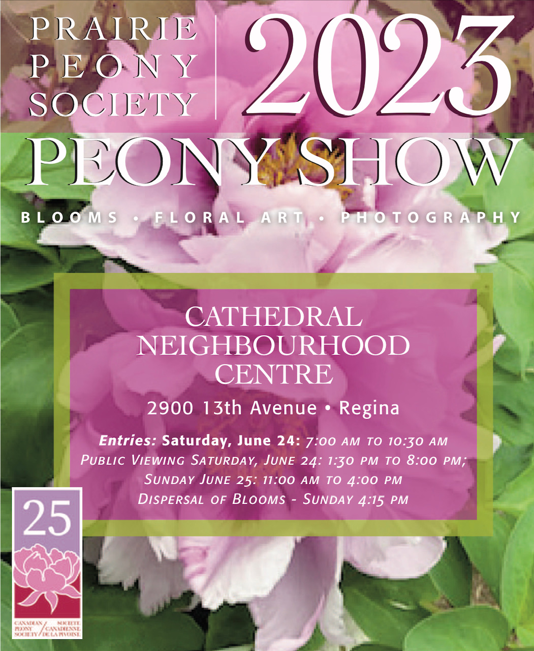 2023 PEONY SHOW – Blooms, Floral Art, Photography Everyone welcome – Free – Hundreds of blooms grown by local gardeners! Hosted by the Prairie Peony Society Saturday, June 24 Entries: 7:00 – 10:30 AM (volunteers available to assist with entries) Public Viewing: 1:30-8:00 PM Sunday, June 25 Public Viewing: 11:00AM-4:00 PM Dispersal of Blooms: 4:15 PM Venue Cathedral Neighbourhood Centre, 2900 – 13th Avenue, Regina S4T 1N7