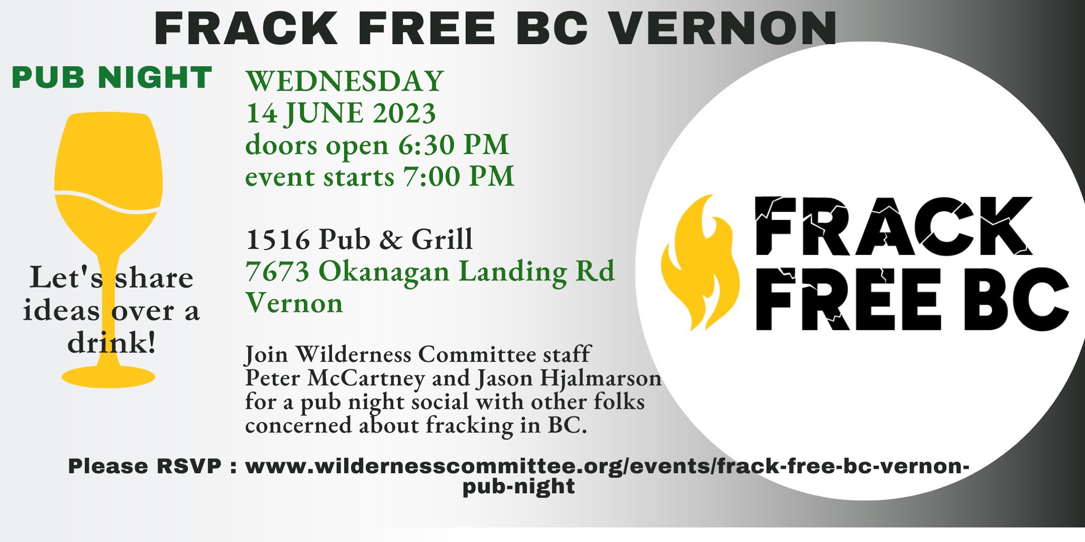 Join Wilderness Committee staff Peter McCartney and Jason Hjalmarson for a pub night social in Vernon with other folks concerned about fracking in BC. We’ll be sharing a short presentation about why fracking is BC’s biggest climate problem and talk about our plans to stop it. Then we’ll spend some time socializing and getting to know each other. We’re looking forward to meeting you! Please RSVP at https://www.wildernesscommittee.org/events/frack-free-bc-vernon-pub-night