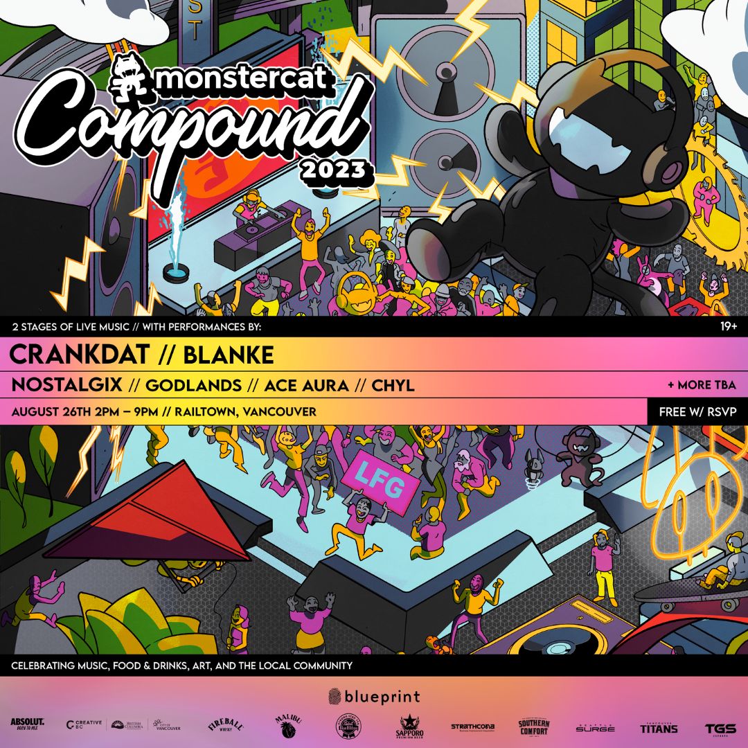 Compound produced in collaboration with Blueprint is an annual free block party held at Monstercat HQ in Railtown, happening Saturday, August 26th, 2023 from 2 p.m. to 9 p.m. Festivities will include live electronic music on two stages; Monstercat artists confirmed to headline the main stage include Crankdat, Blanke, Nostalgix, Godlands, Ace Aura and CHYL with more performers to be announced. Attendees will be treated to some of Vancouver’s best local offerings including food trucks, street artists, and body painting. Those planning to attend are encouraged to advance RSVP for free here and for those seeking an enhanced experience, including premium lounge access, a separate bar, better stage views, and a 3-month subscription to Monstercat Gold, a limited run of VIP passes for purchase for $39.50 are available.
