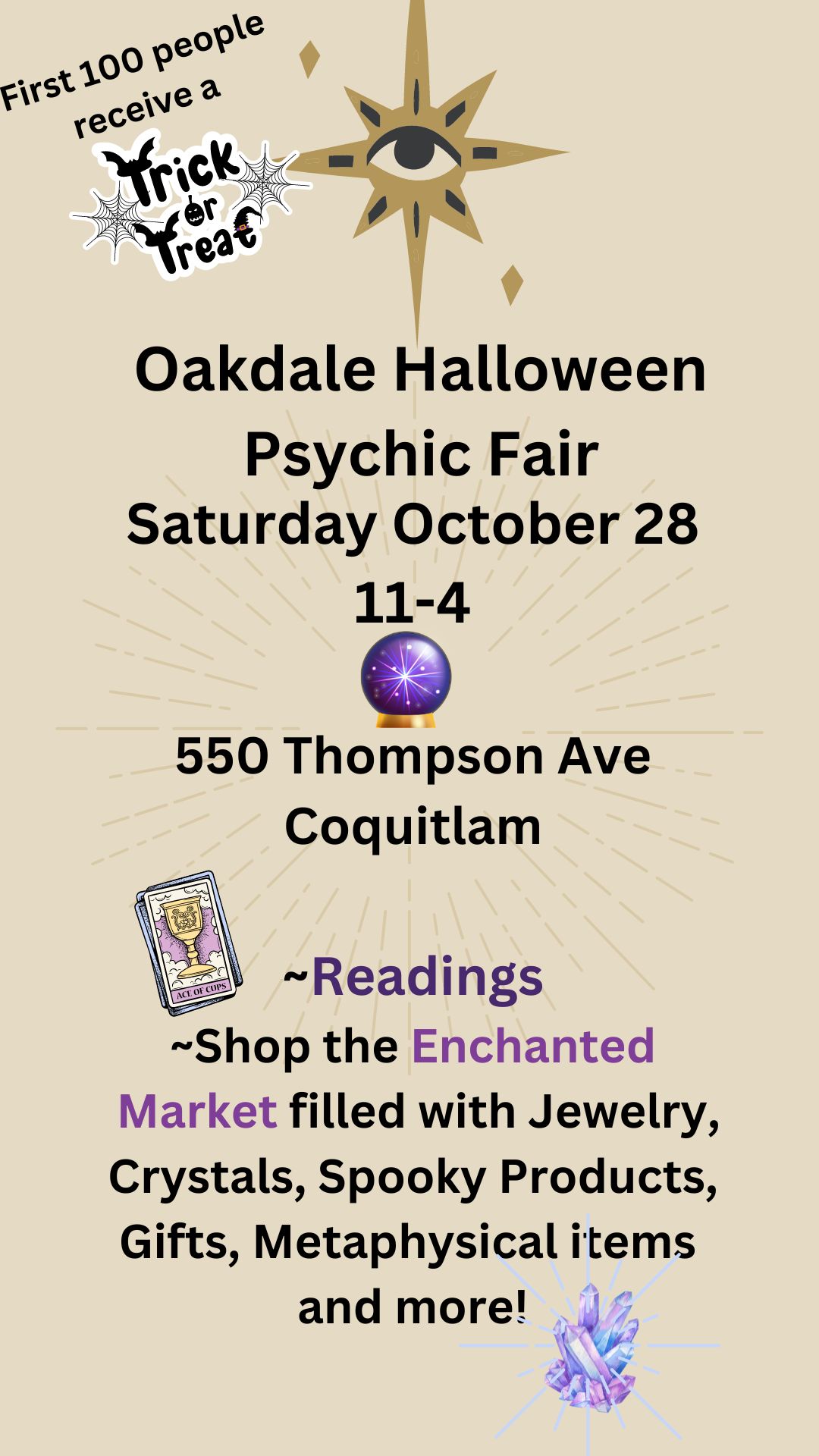 40+ Artisans and Readers Halloween themed crafts in the Enchanted Market Crystals and Metaphysical items Enjoy a reading from many skilled and varied readers Aura Photography Raffle to benefit Special Needs Children First 100 people receive a free gift Get into the Halloween Spirit!