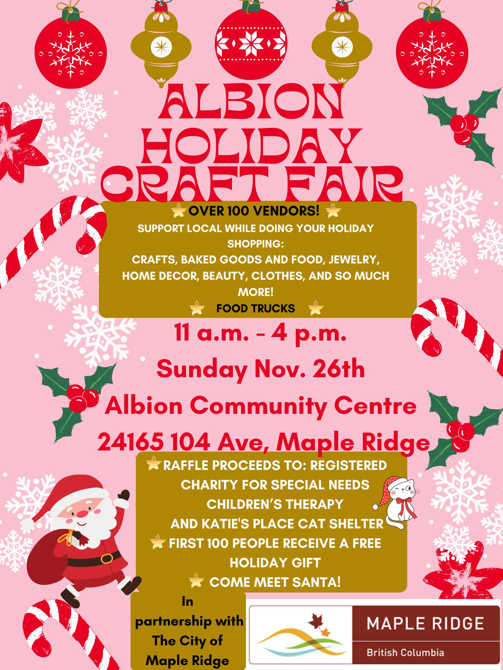 – Over 100+ Vendors in Albion, Maple Ridge – Meet Santa – Charity Raffle – Food Trucks – First 100 People receive a FREE GIFT – In partnership with the City of Maple Ridge! SHOP LOCAL/SUPPORT LOCAL!