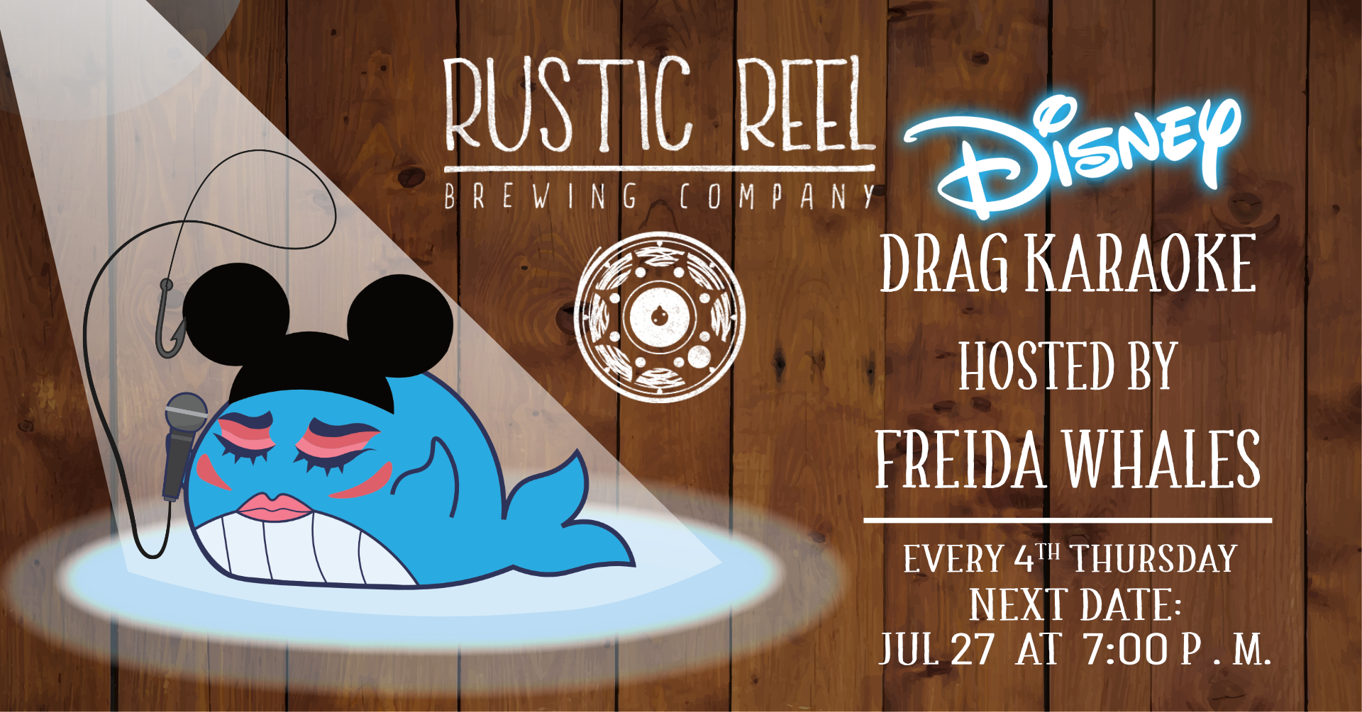 Come get hooked at Rustic Reel Brewing Co. and sing your heart out! I’ll be bringing the mouse back with me from the land of Disney! Join us in costume or just for a great time singing your childhood classics! As always it will be a whale of a time! From 7:00 p.m. to 10:00 p.m. THEME: Disney!