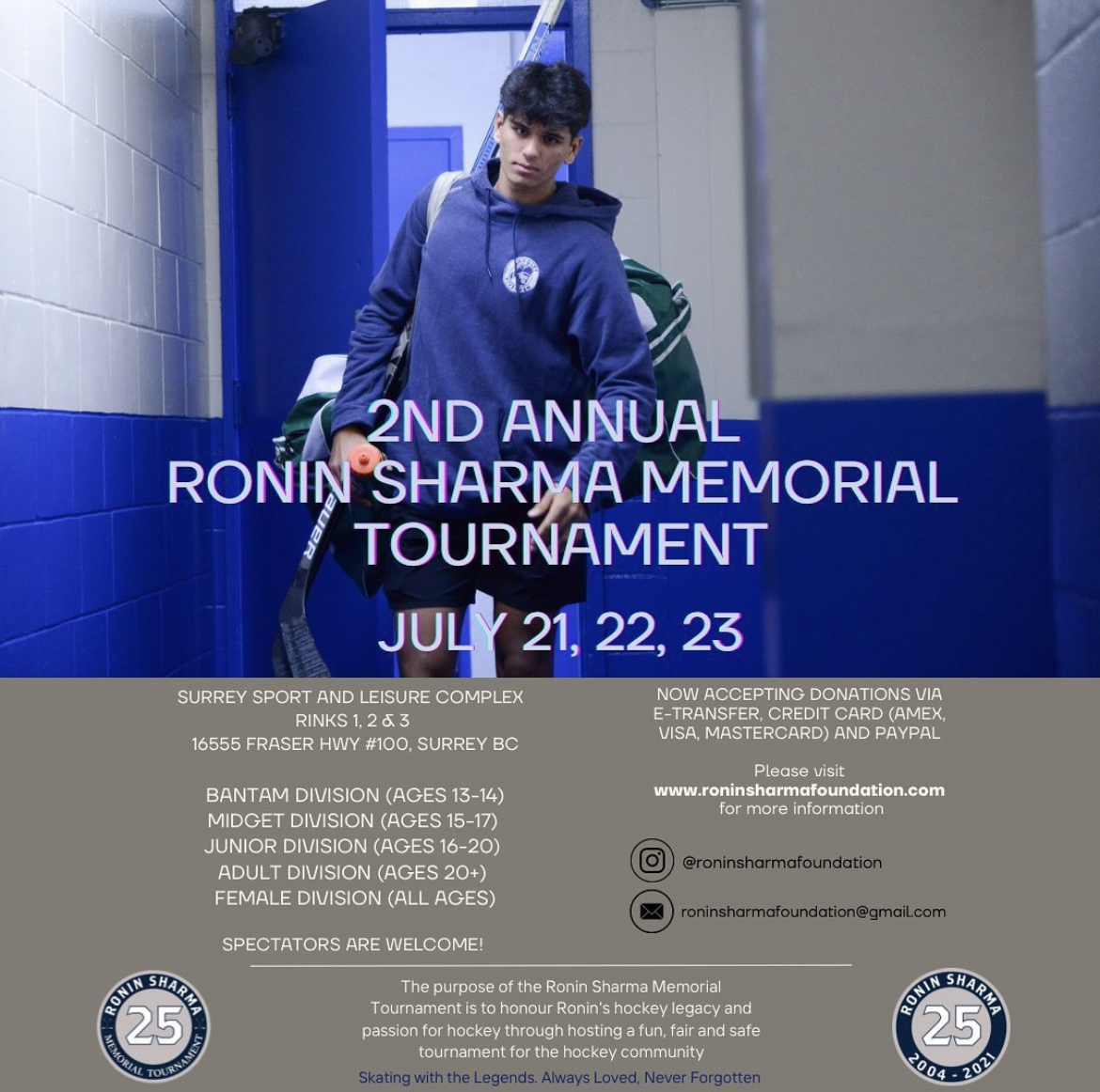 The Ronin Sharma Foundation will be hosting our 2nd Annual Ronin Sharma Memorial Tournament July 21 to July 23, 2023, at the Surrey Sport & Leisure Complex. This tournament will include multiple divisions ranging from 13 to 20+ years in age. And this year, we are happy to announce we have added a female division. Ronin Sharma was an amazing soul that excelled in many avenues, with the strongest being his love and passion for the sport of Hockey. At the age of 2 he picked up a hockey stick and until his last day he never put it down. Ronin’s dream was to play in the NHL, and his determination and sacrifices were all leading him down that path. His dedication to the sport was immaculate, and many called it “unmatched”. Ronin spent 7 days a week playing, training, and exercising to perfect his craft. Unfortunately, he never got to see that dream through, as his journey was cut short at the young age of 16 years old. The Ronin Sharma Foundation has been established to honour his legacy by helping others achieve their dreams. Through fundraising and hosting events such as this tournament we will provide bursaries and scholarships to individuals wanting to pursue further education. Along with this we will provide children who wish to play sports but may not have the financial means to do so, an opportunity to partake in the sport they wish to play.