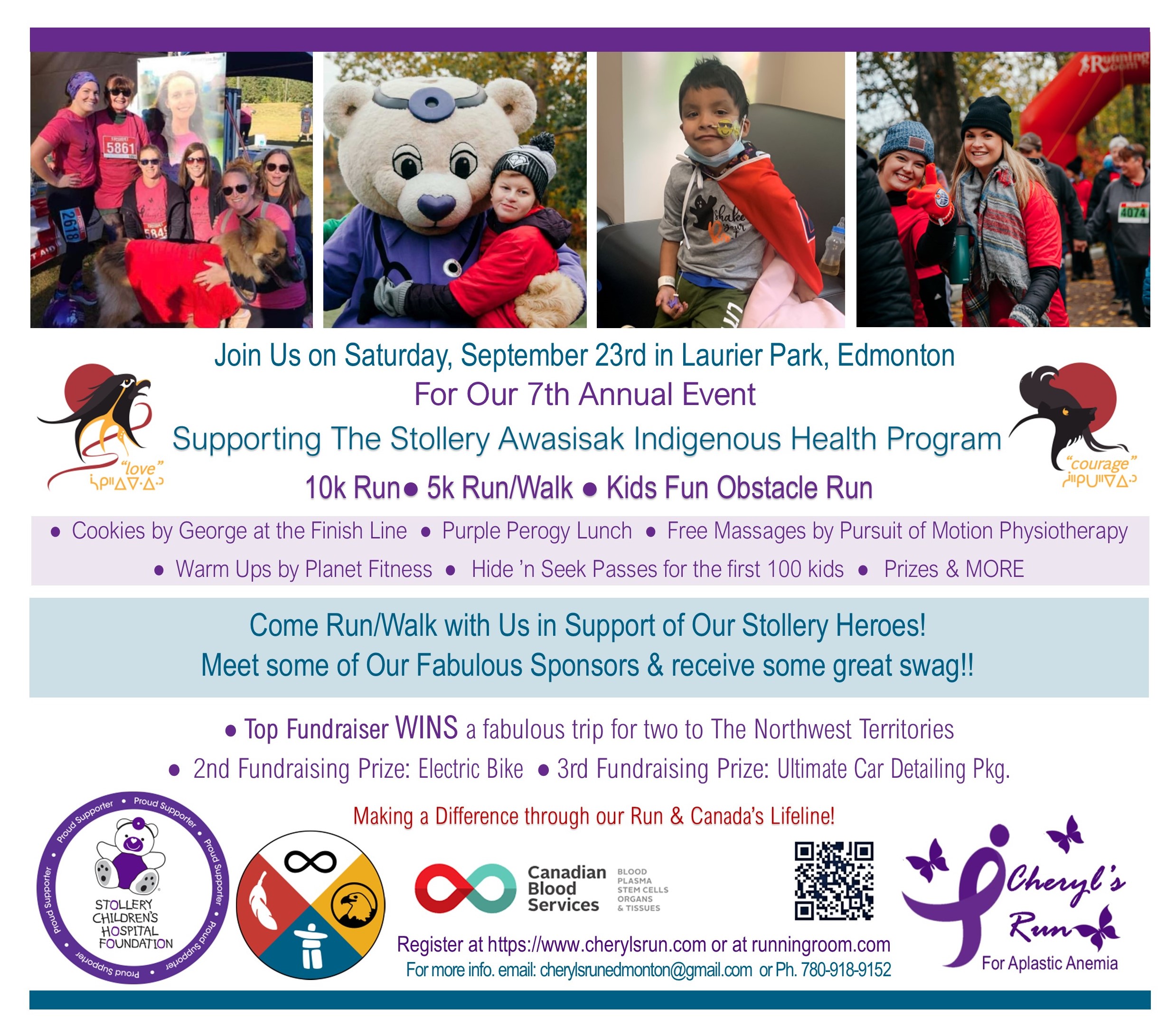 Cheryl’s Run is now in it’s 7th year! We’ll be down in Laurier Park on Sat. Sept. 23rd with a 10k run, a 5k run/walk and a kids obstacle run. The event is in support of The Awasisak Indigenous Health program at the Stollery. We’ll have free massages by In Pursuit of Motion Physiotherapy, warm ups by Planet Fitness, free lunch by The Purple Perogy and Cookies by George at the finish line! The top fundraising prize is a trip for two to Yellowknife to hunt the northern lights courtesy of Canadian North Airlines, The Explorer Hotel, and North Star Adventures, an indigenous adventure company in Yellowknife. The second fundraising prize is an electric bike from Shoppers Drug Mart, and the third fundraising prize is a deluxe car detailing package from WEM Toyota. We also have lots of other prizes to give away to lucky participants and sponsors will be there handing out swag and joining in the fun. The kids run is special this year as it’s in memory of two very special children who were both Stollery kids and who we featured on our posters and social media over the years. Willie was from Fox Lake Alberta and was part of the Stollery Awasisak program. He sadly passed away last June but it didn’t stop his family from driving the 11 hours to Edmonton to be part of the event. His grandfather wore his signature hero cape and ran 10k. Emma was also one of our poster children and we sadly lost her just this past Spring. You could always find her leading the Stollery Bear Dr Patch Up around the park at our run.