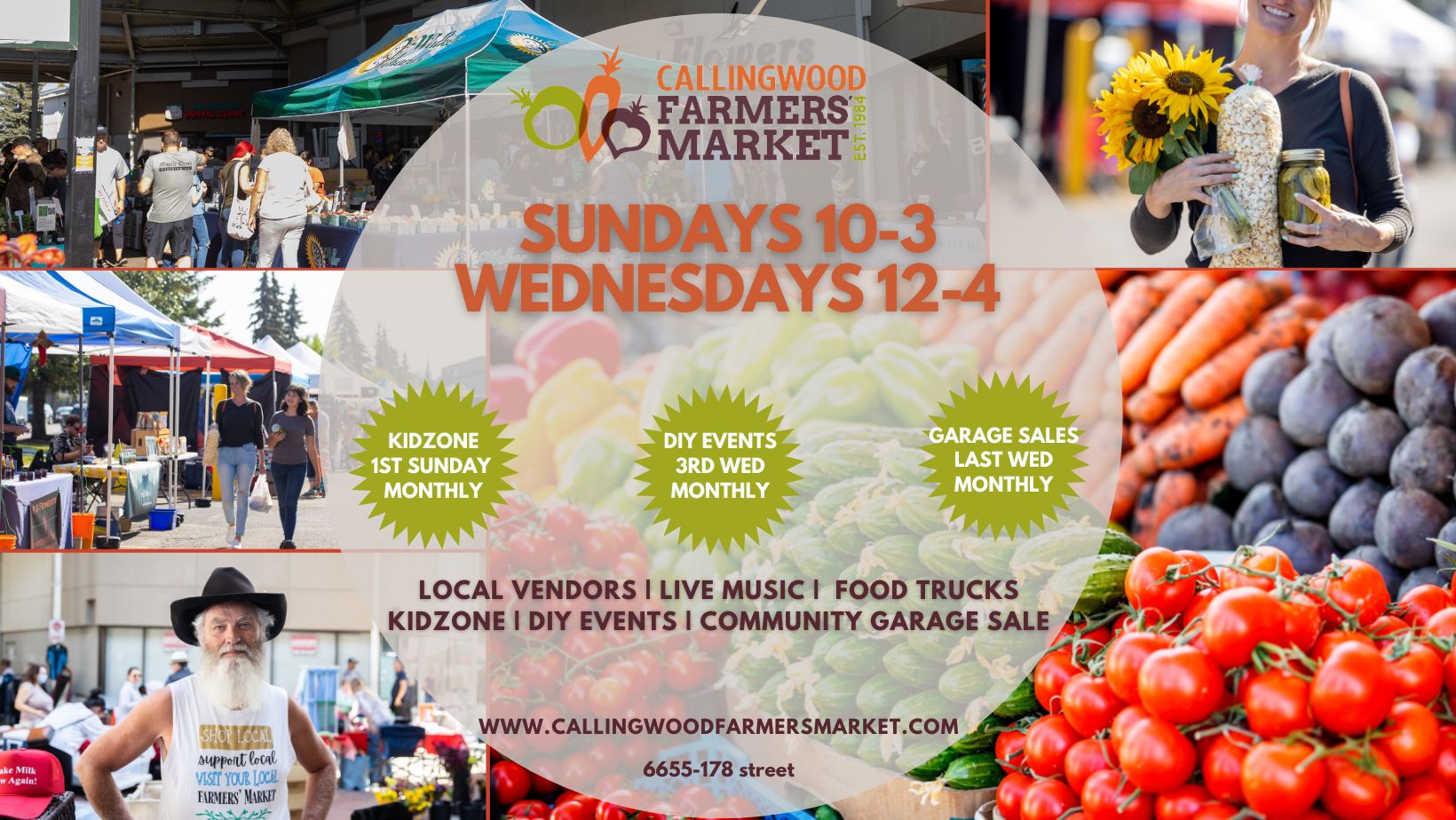 The Callingwood Farmers’ Market runs every Sunday from 10AM-3PM with over 120+ vendors. The Mini Market runs Wednesdays from 12PM-4PM