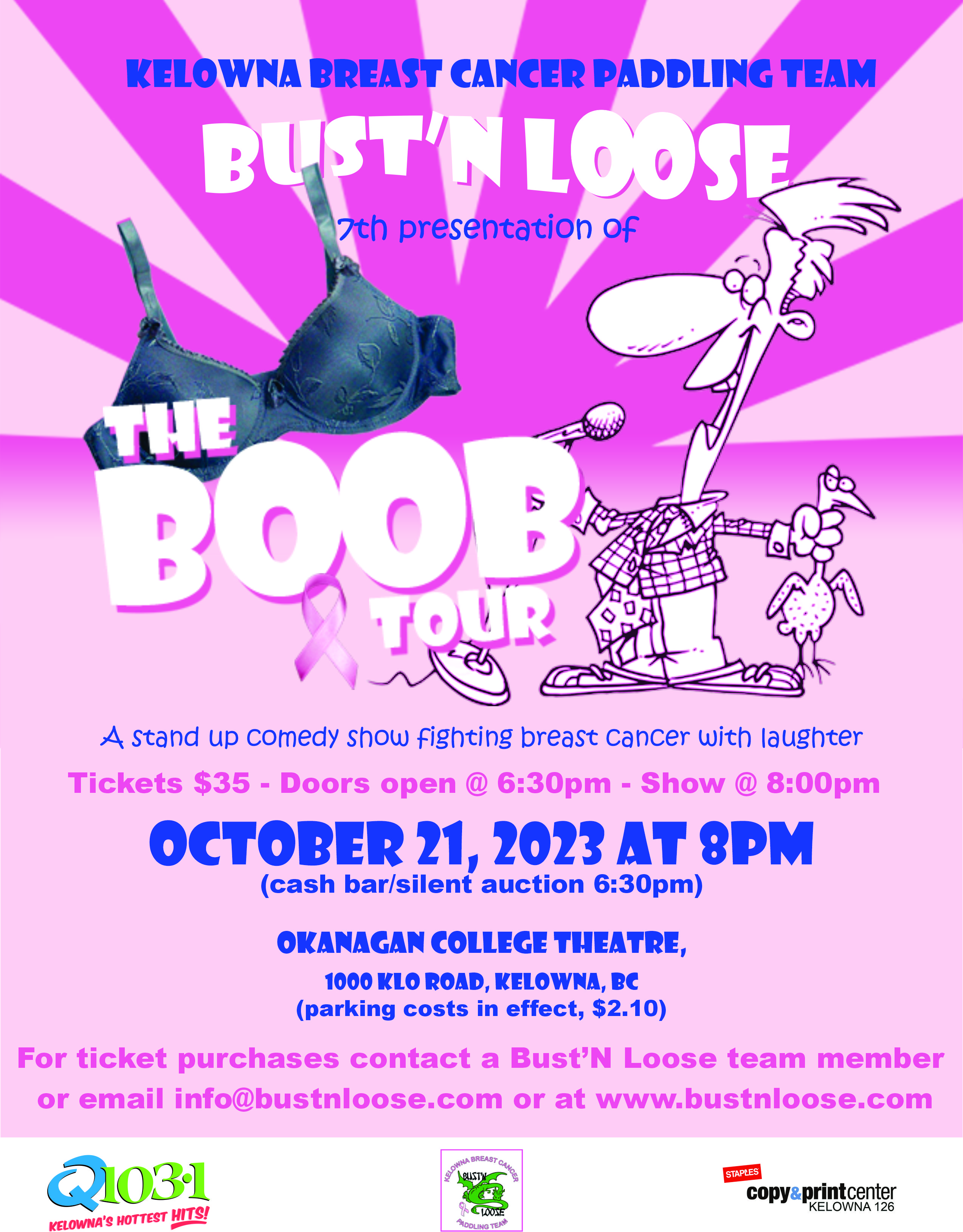 The Kelowna Breast Cancer Paddling Team (Bust’n Loose) presents THE BOOB TOUR, a stand up comedy show fighting breast cancer with laughter. This fundraiser helps support those who have been diagnosed with breast cancer and now dragon boat for health and well-being.